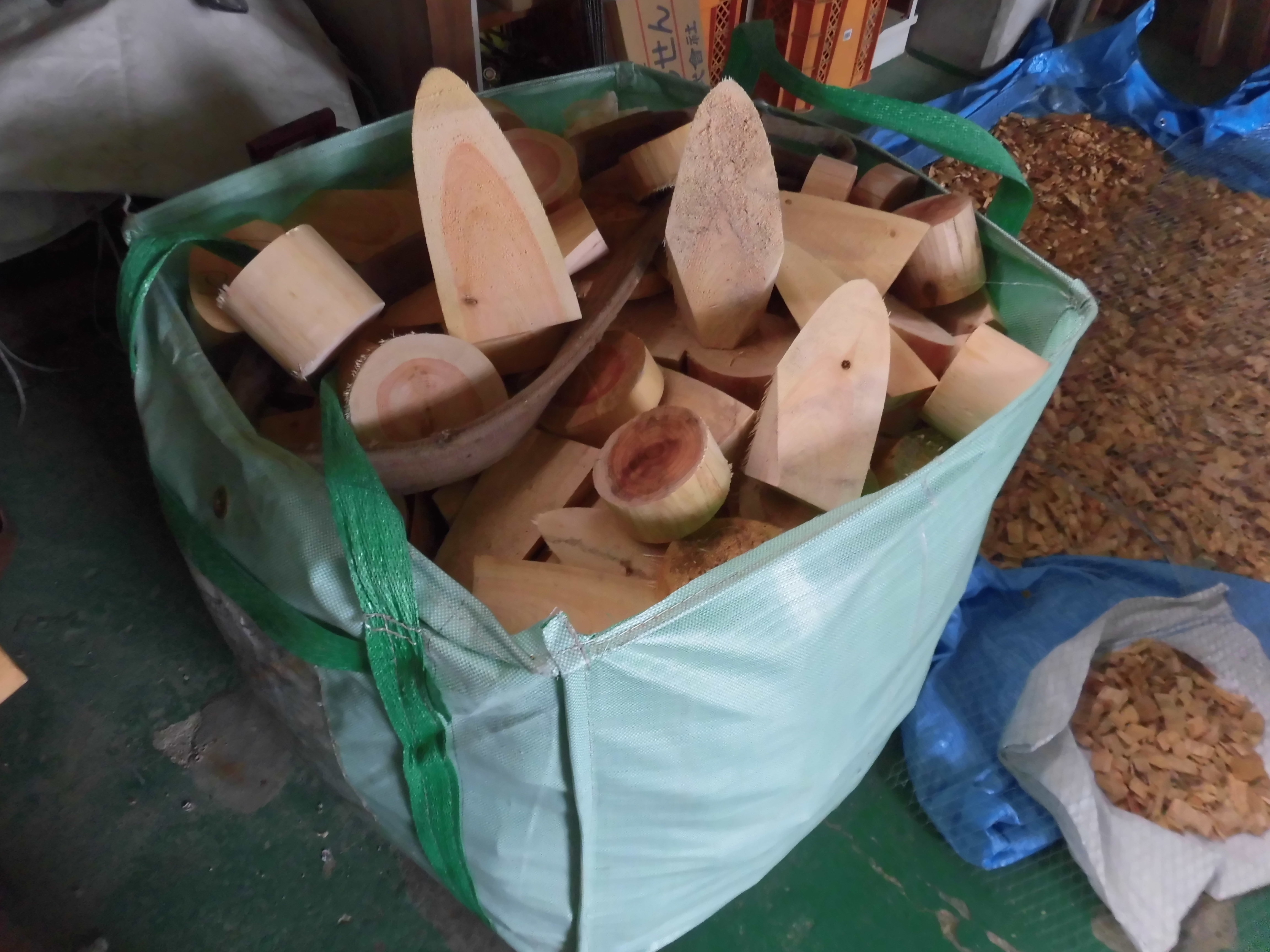 丸い棒状の木材の先端を杭のようにカットしたら出る端材です。