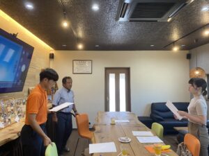 早速、オリエンテーションをし、吉武の会社説明や、社長の熱い想いを聞いてもらい