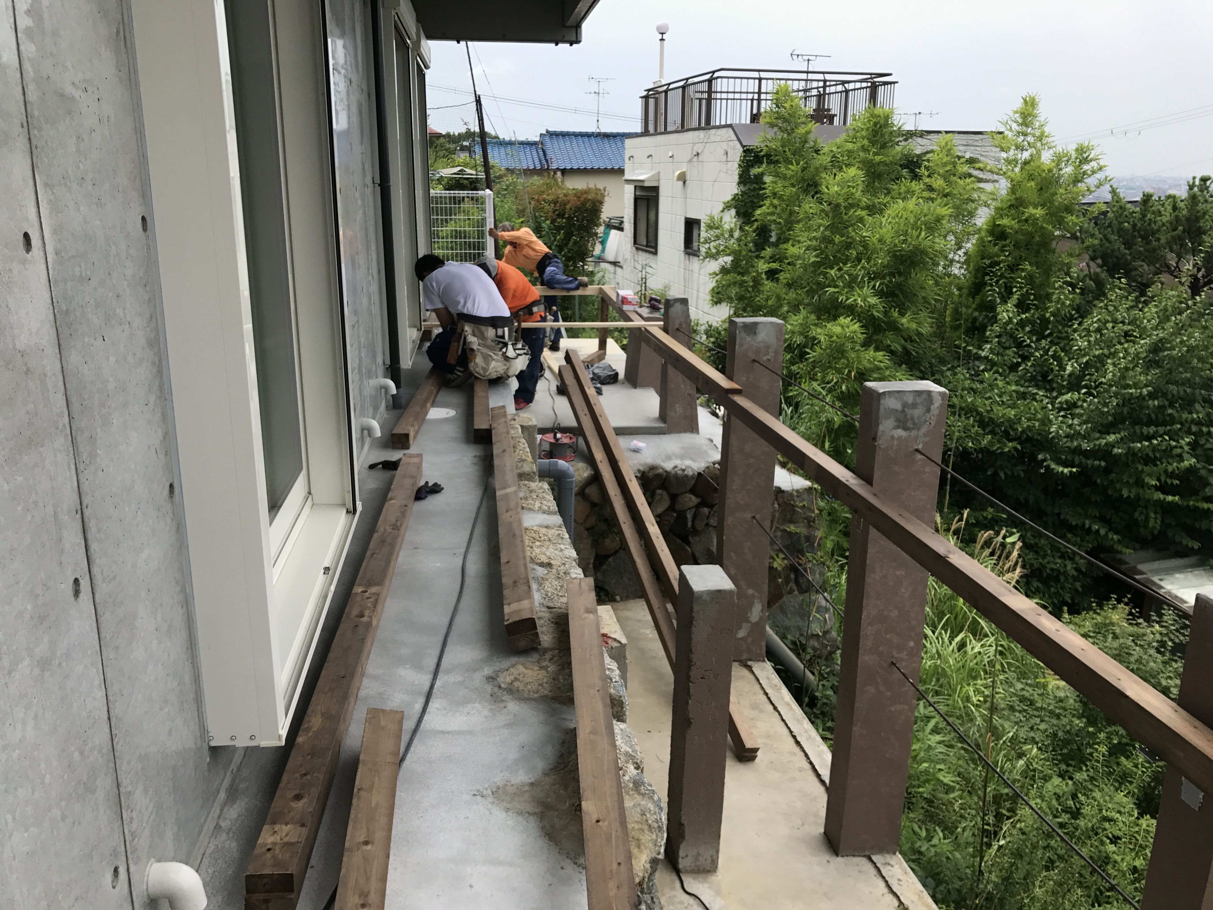 新築工事現場、引き渡し後1階のデッキ工事が本日からスタートしました。
