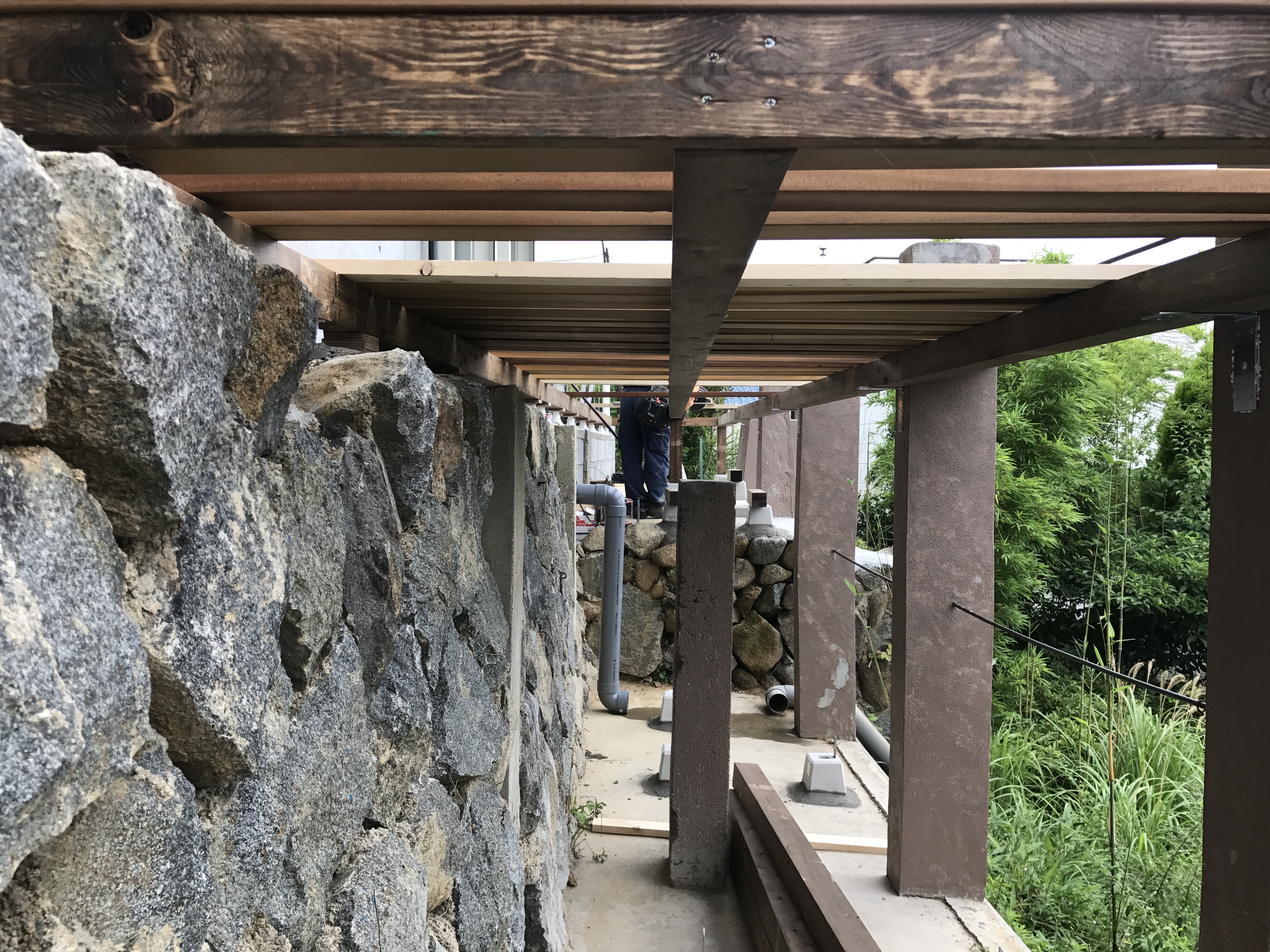 建物の幅を最大限に活かした寸法なので、既存のコンクリート柱等利用して土台を施工しております。