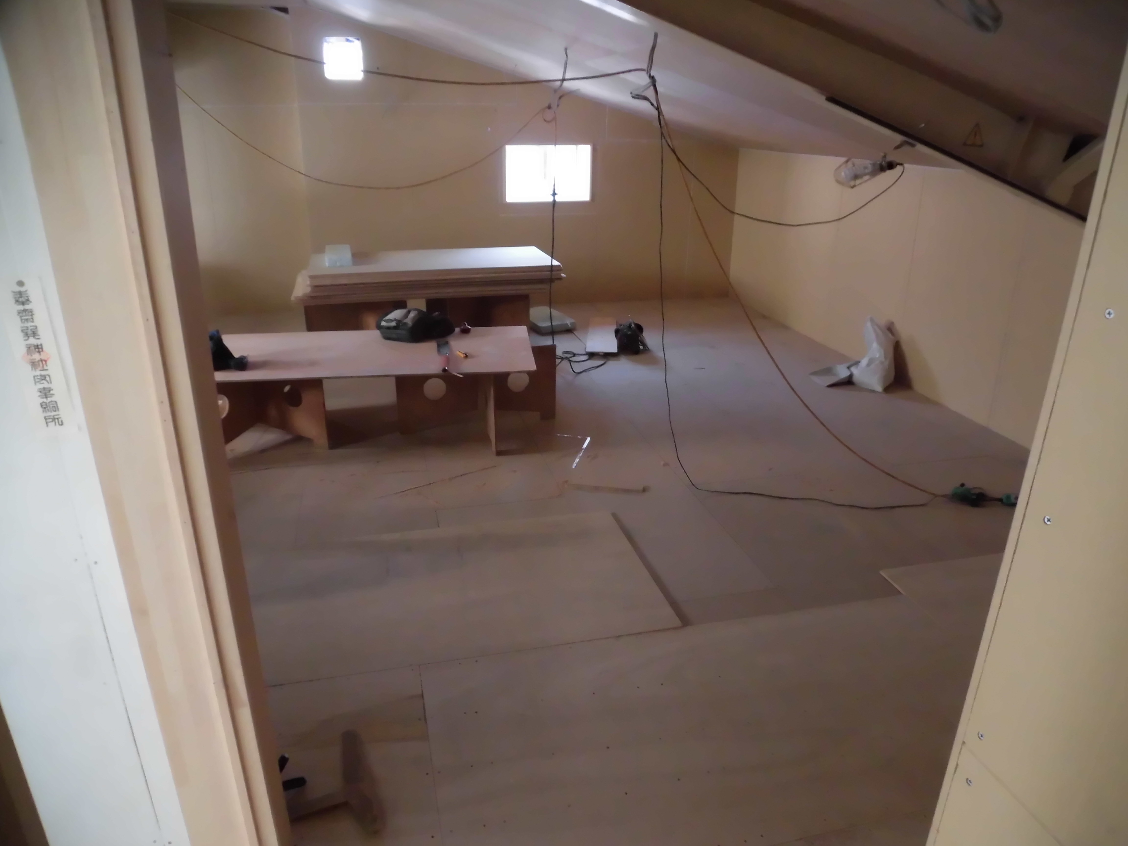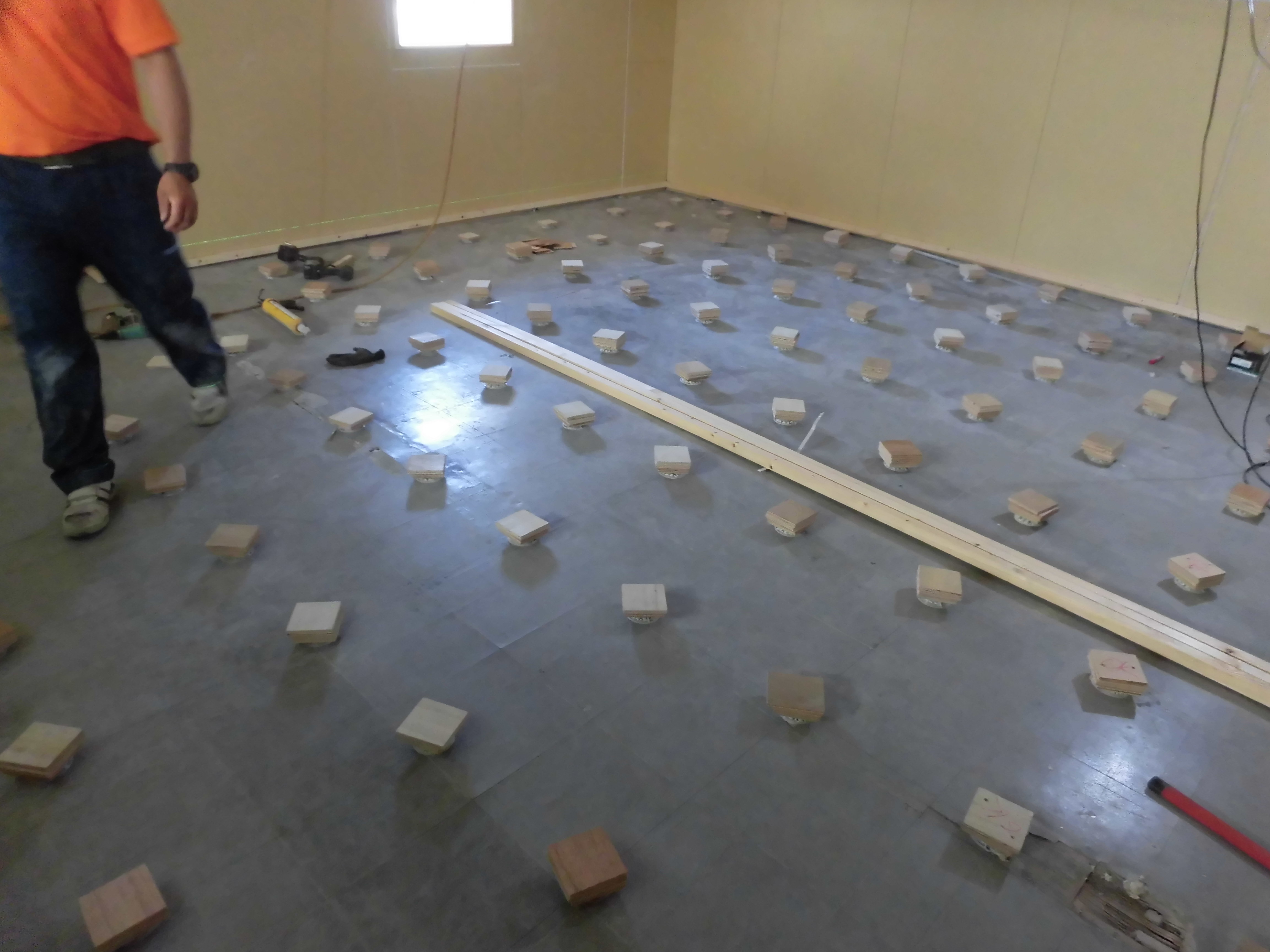 ひとつひとつ高さを確認し、高さを調節してパーチクルボードを張り付け、その上にコンパネを張って床下地工事は終わりです。