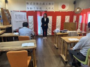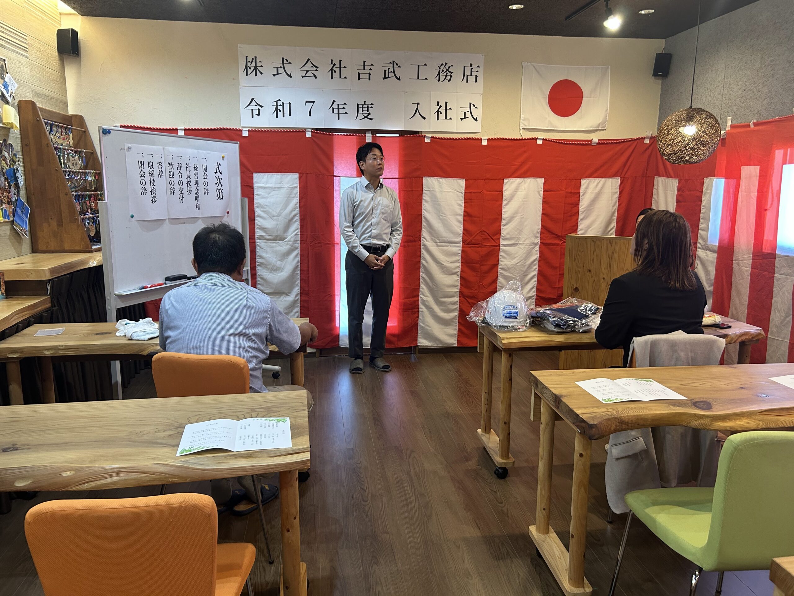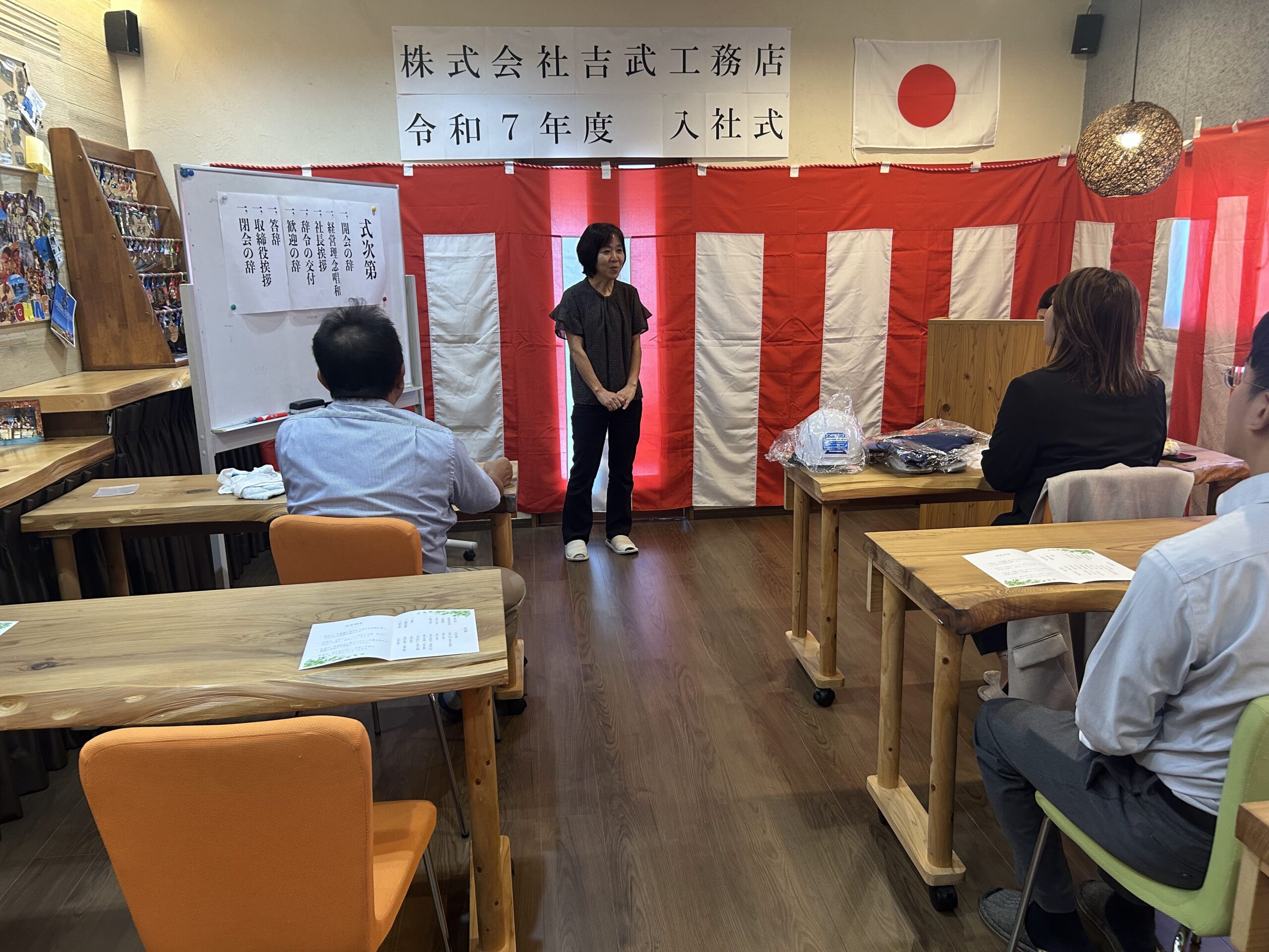 代表挨拶から、辞令の交付(作業着やヘルメットなどもこの時にお渡ししました!)
