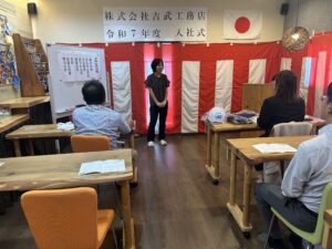今年度で3回目の入社式でしたが、少しパワーアップして、国旗を掲げたり