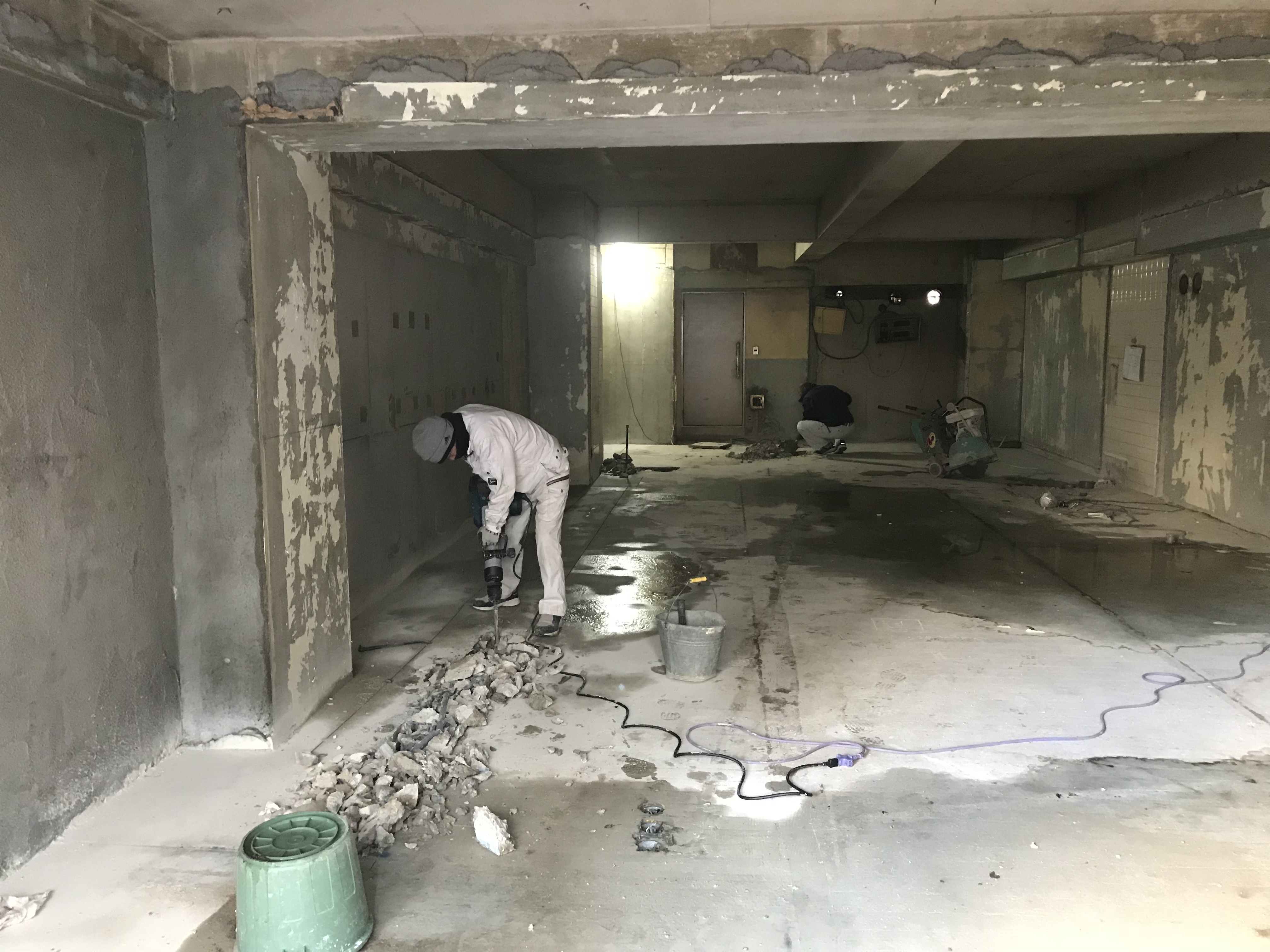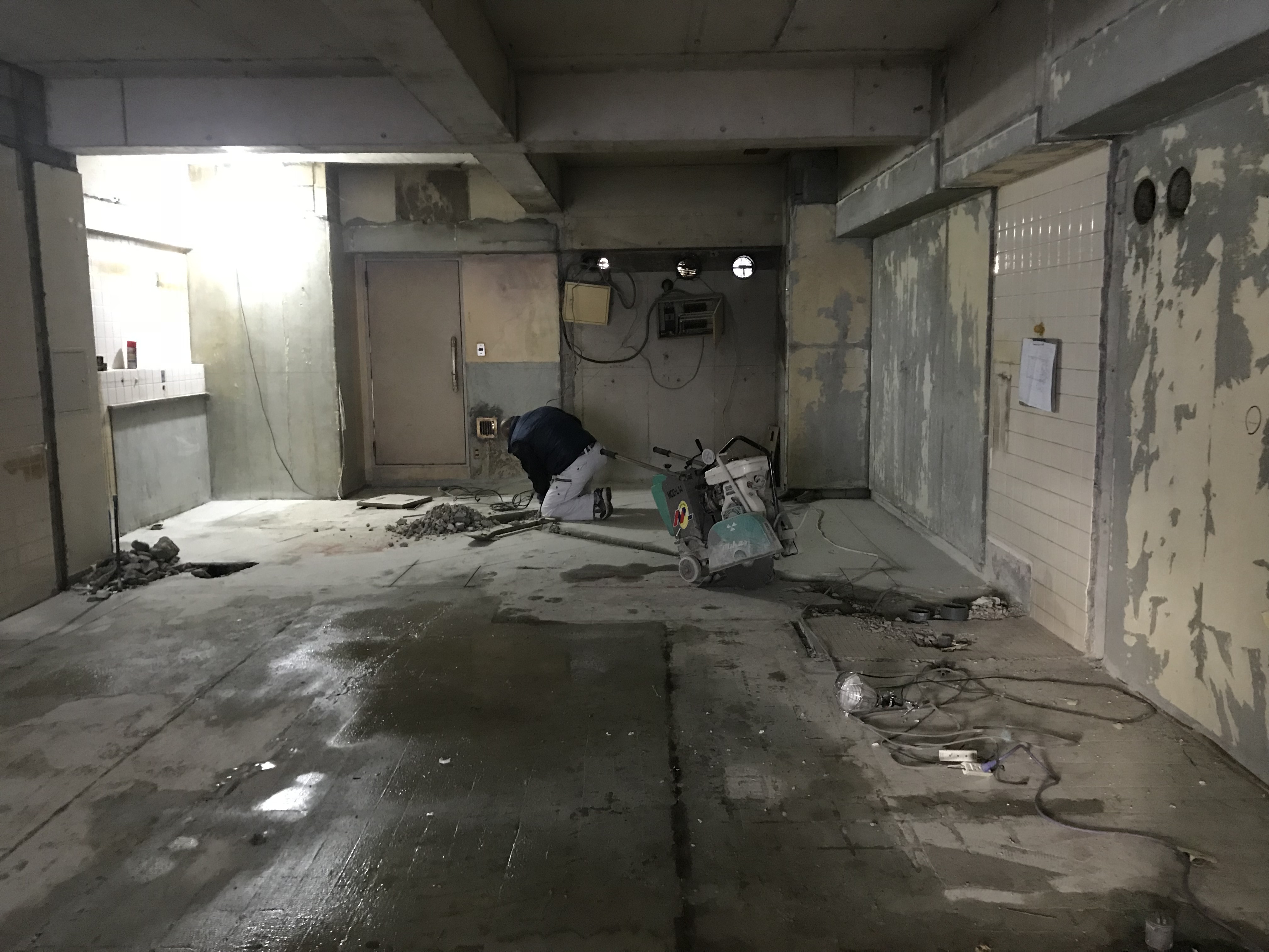 なので、トイレ等設備に係る配管は全て土間のコンクリートを割って配管していきます。しっかりとしたコンクリートを施工しているので、割るのがとても大変です。