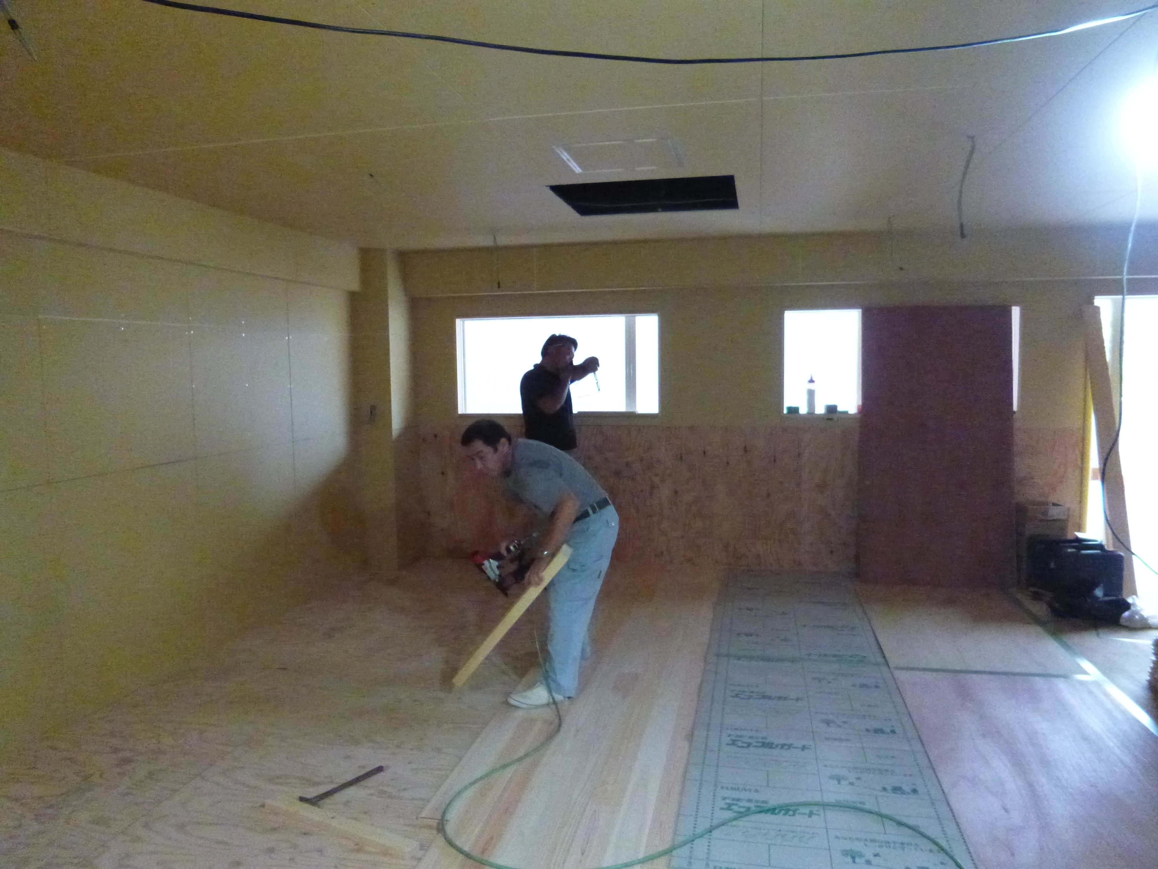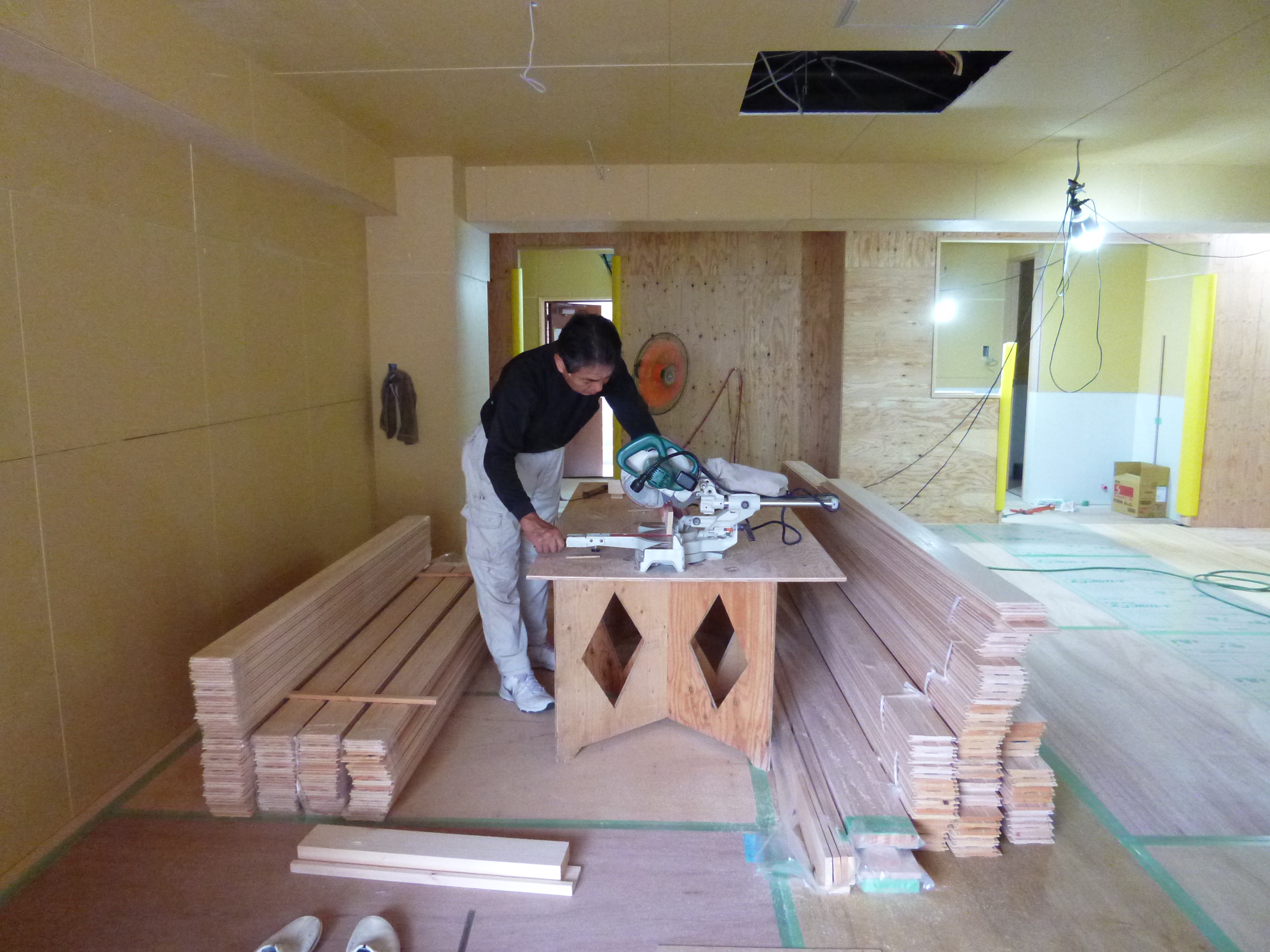 今回のフロアや腰板の材料は大阪の桧材です。私も初めて知ったのですが、大阪の材木「大阪材」というのがあり、その材料を使用することで面積に応じた補助金が出るそうです!今回はそれを活用する為、保育室は大阪桧のフロアに桧の腰板です。杉とはまた違った色見や風合いがあり綺麗です。