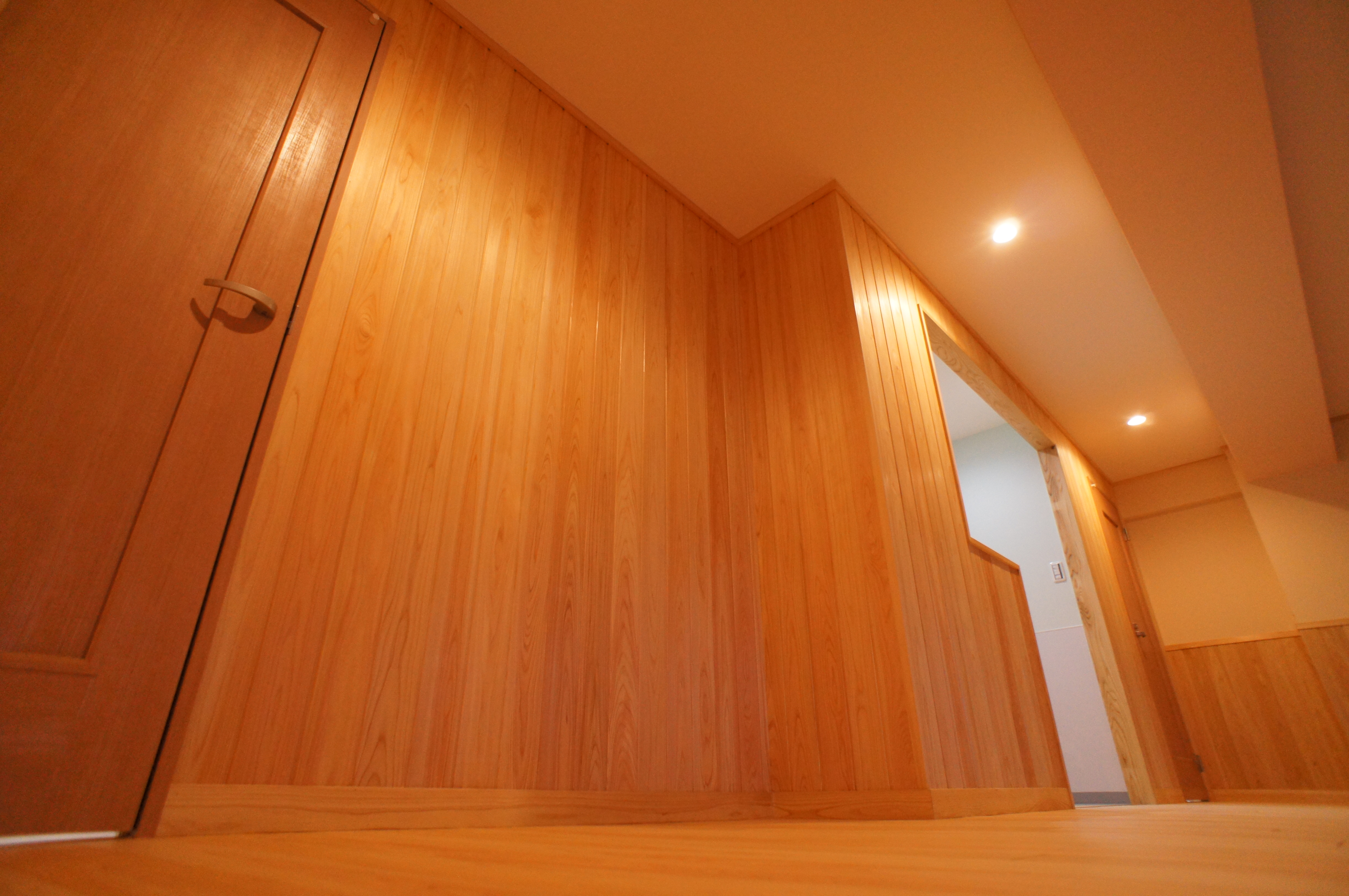 床から天井まで桧の腰板を張り、ここだけ電球色のダウンライトにすることで雰囲気の良い空間となりました!お施主様もすごく喜んでくれました!