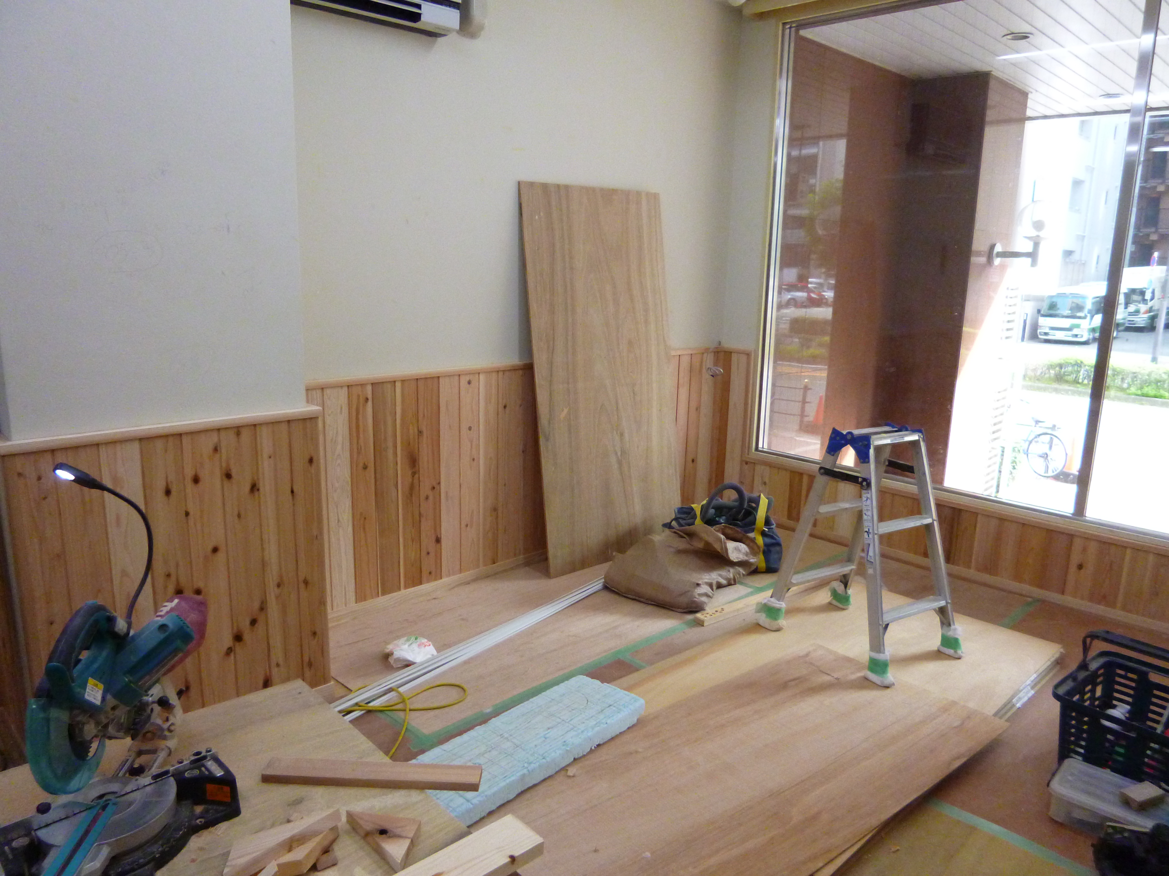 今回はビルの1階で杉の腰板に無垢フロアの自然素材空間です。