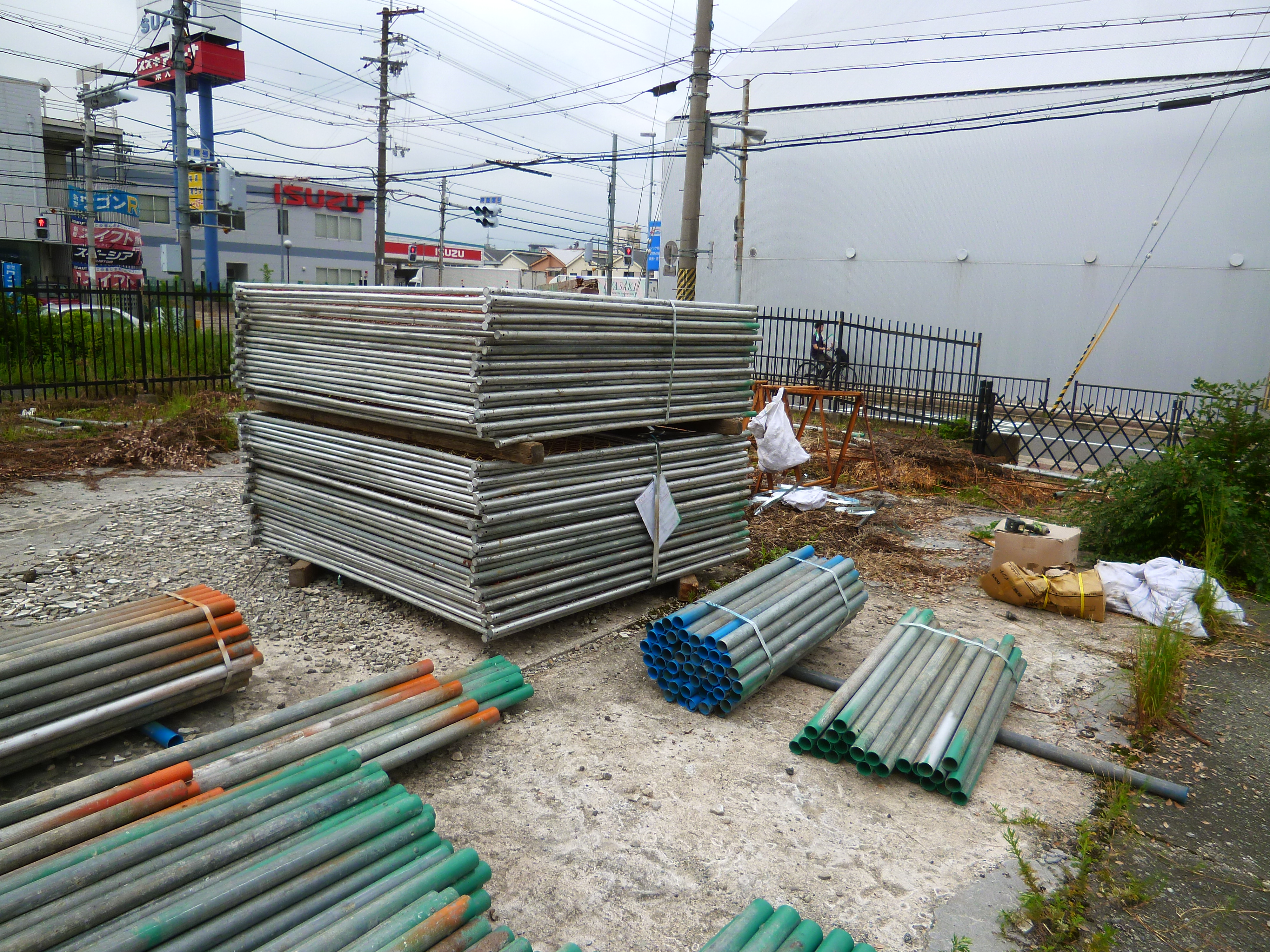 ただ今フェンスバリケードと防音パネルを施工するために単管や枠組み足場を用いて下地を組み立てています。