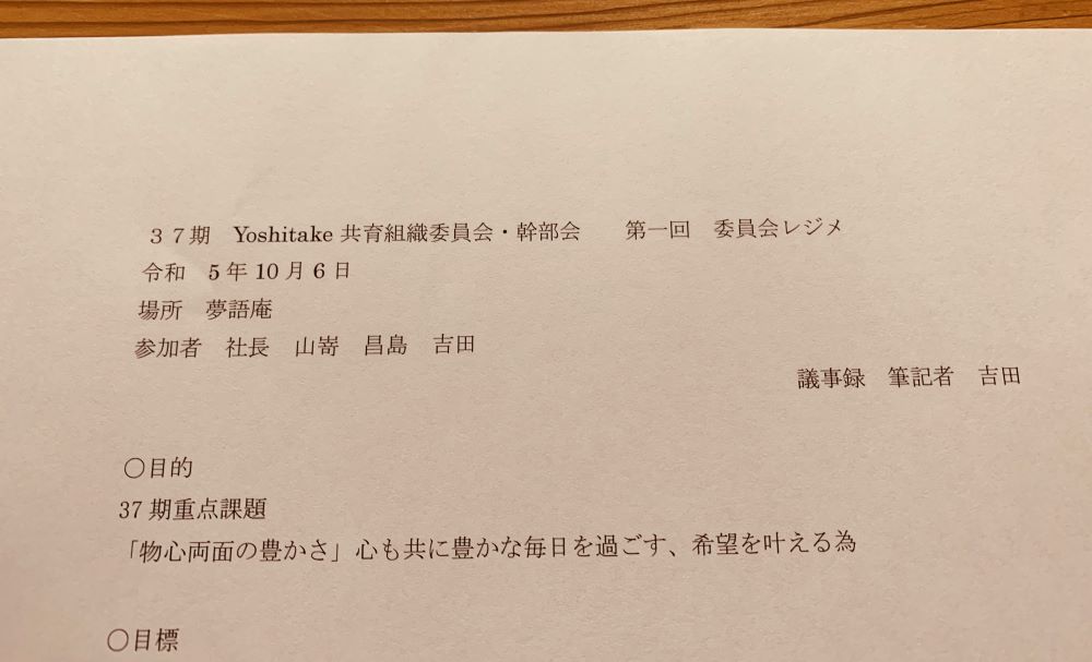 共育組織委員会は、社長と幹部で、会社をよりよくするため、就業環境、給与や休日、福利厚生など、議題を出し考えています。