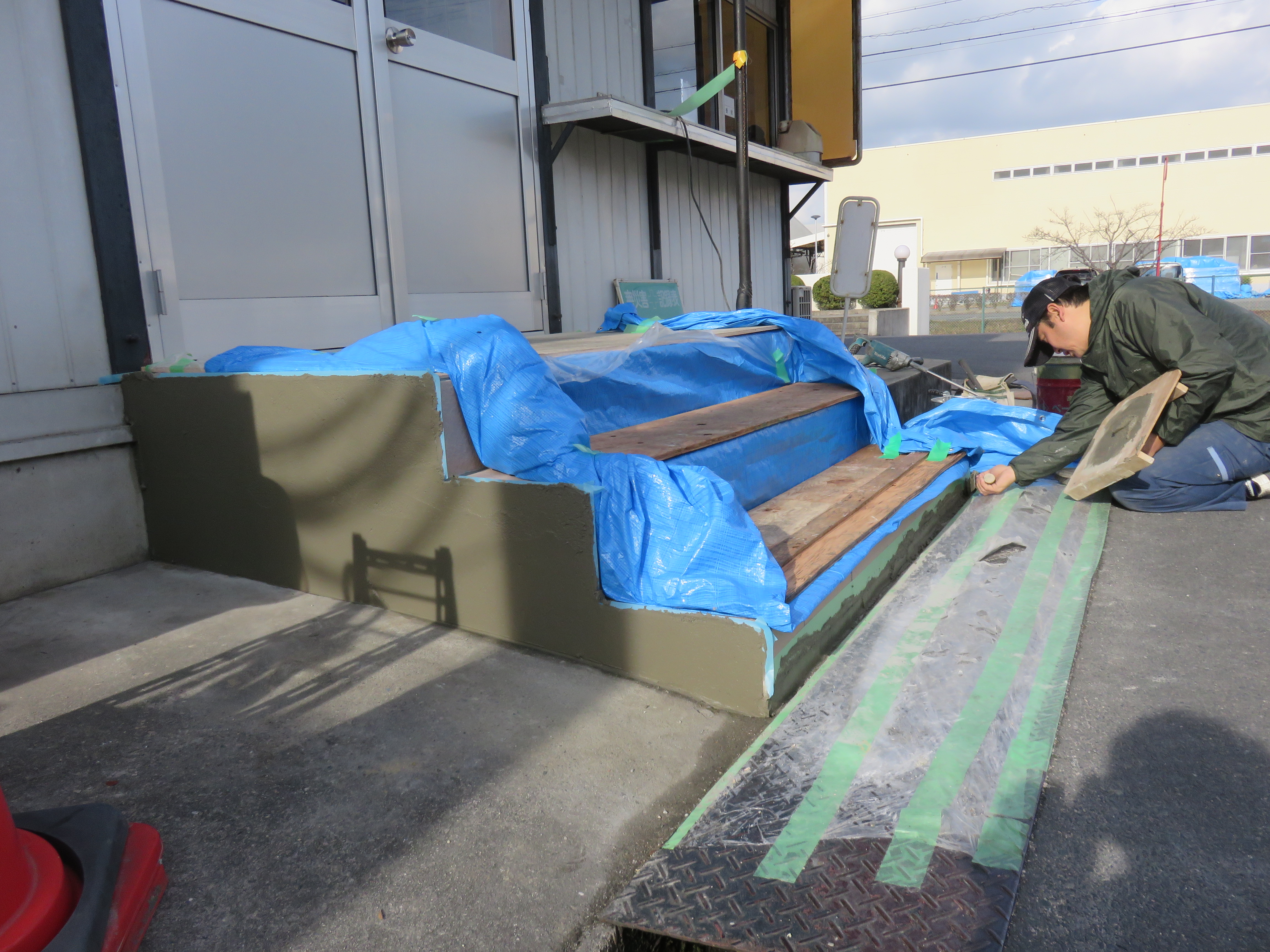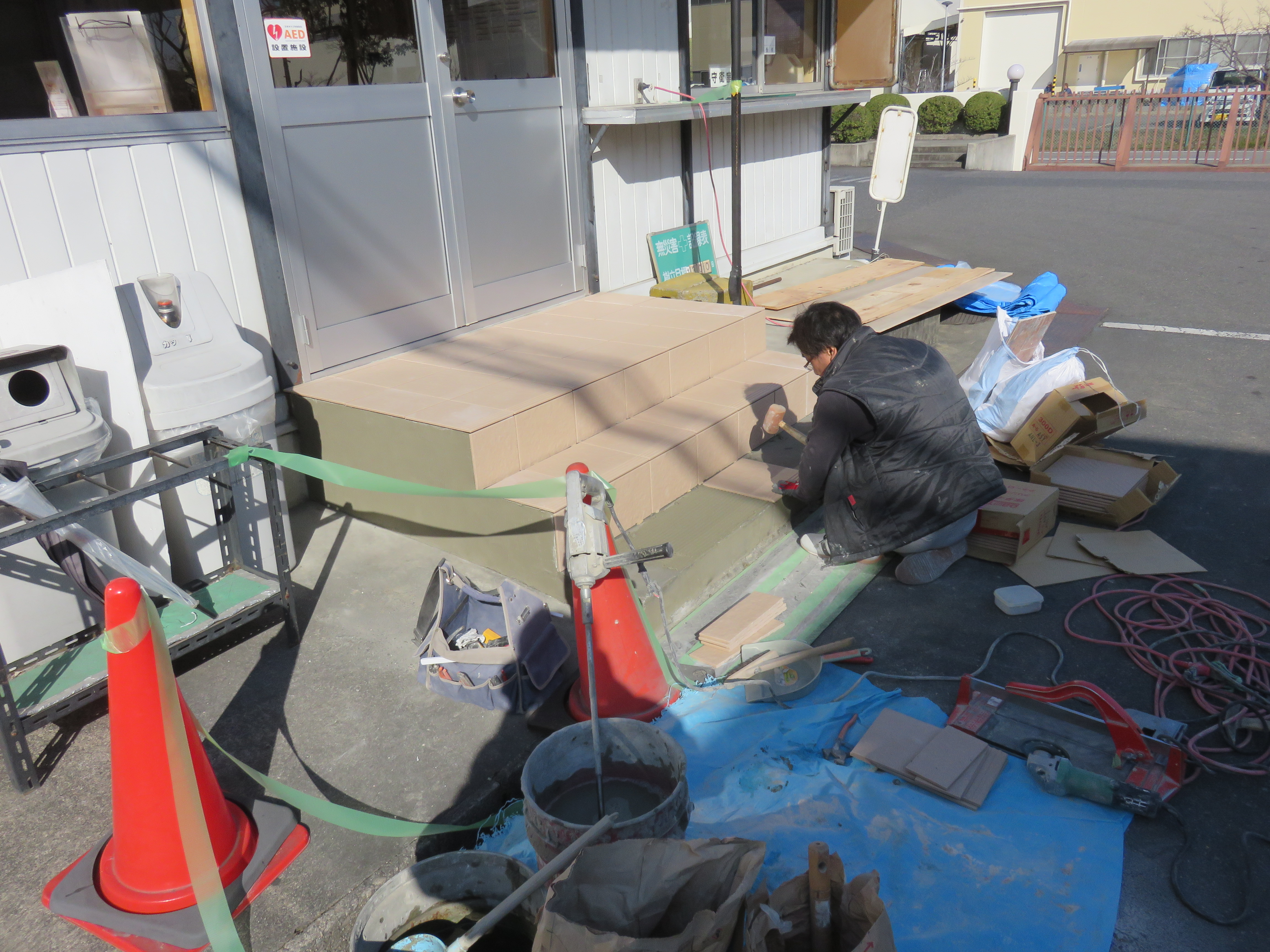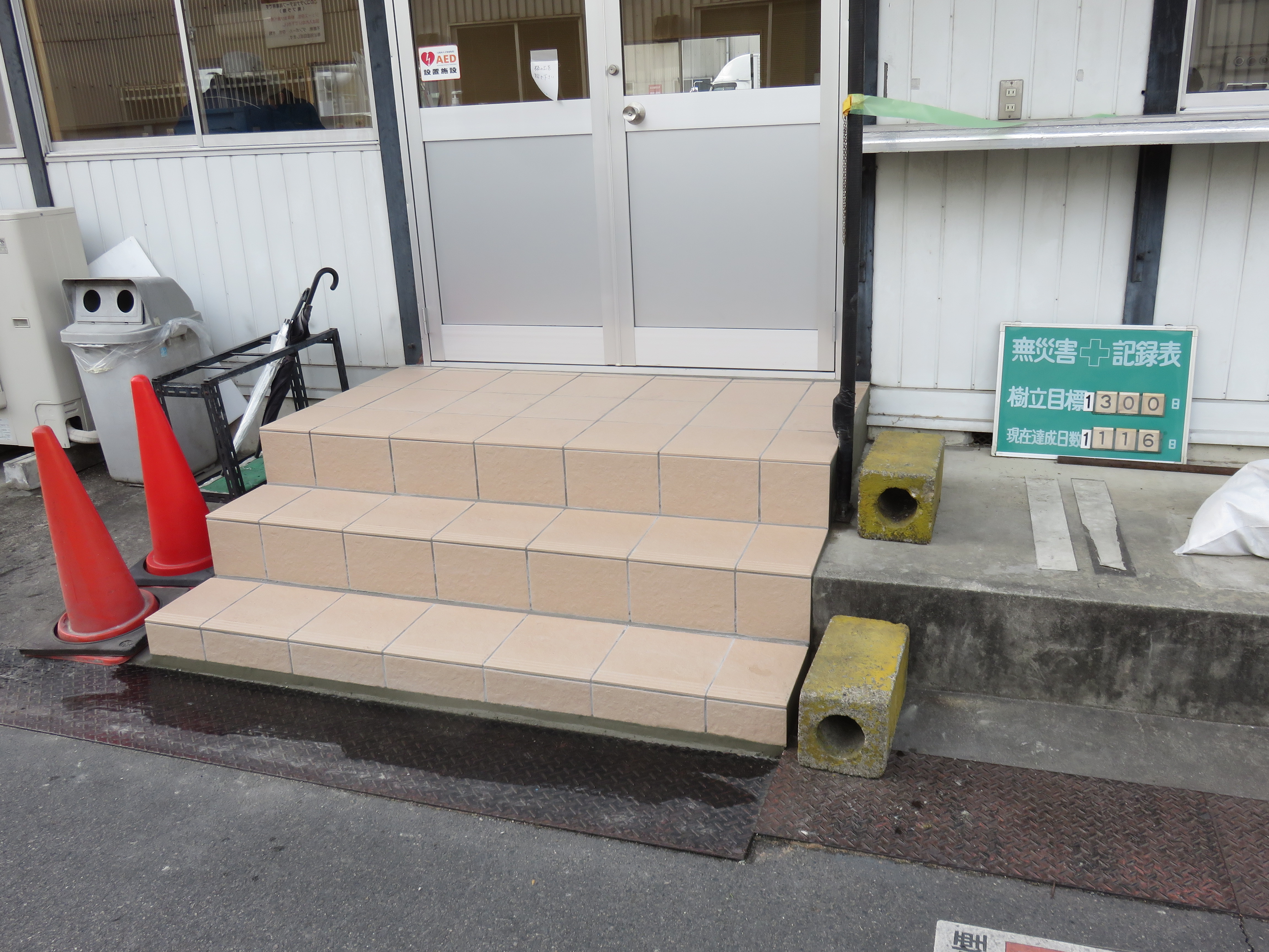 その翌日月曜日に、階段側部のモルタル補修し、タイル貼り工事を完了させました。