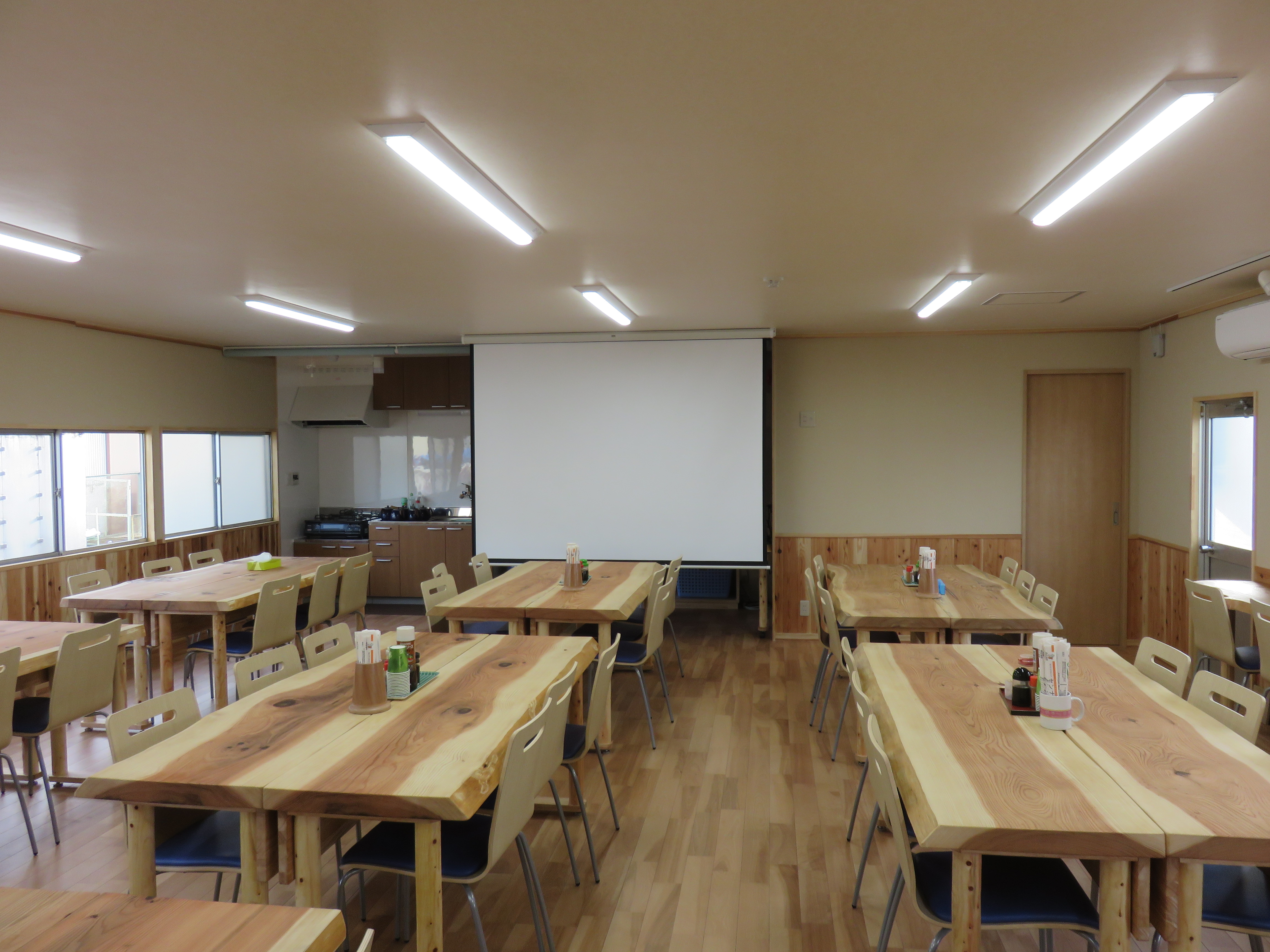 また、社員食堂内にもプロジェクタースクリーンを取り付けて