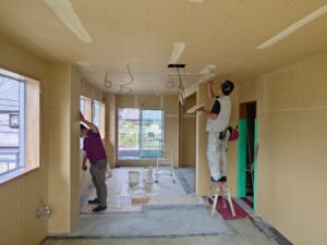 天井と壁はクロス仕上がりのため、入念にパテを行ってからクロスを貼っております。