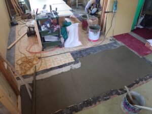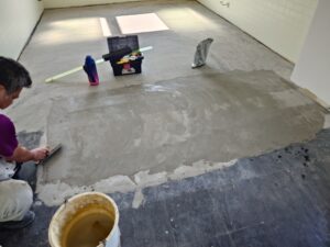 モルタルでレベル調整を行った上で、さらに下地調整をして床仕上げ材を貼りました。