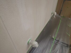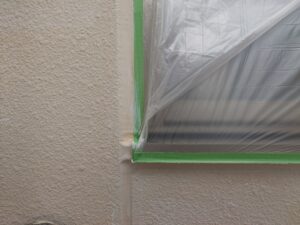 外壁一面の目地、設備器具周りのコーキングも打った上で、外壁塗装を行っています。