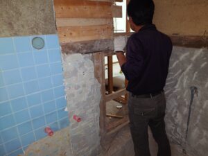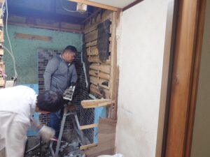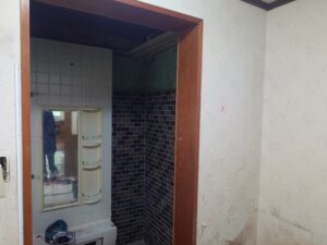 クローゼット内と新たにドアを設置する壁面を解体しているところを浴室の方から見ていると、
