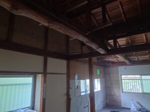 ここから既存の丸太梁を見せるようにして新たに天井を造作していきます。