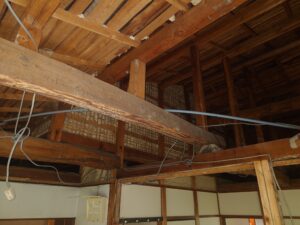 天井を落とすと、丸太梁を使った小屋組が見えるようになりました。