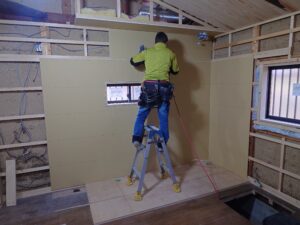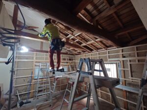 勾配天井は一番高いところで4m近くあるので、長い脚立と足場板を使いながら杉板を張っていきました。
