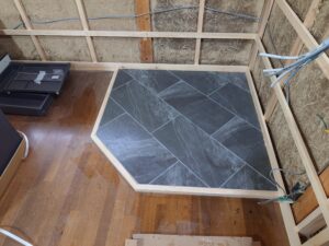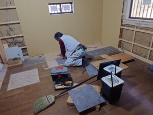 そして、こちらはLDK内の薪ストーブを据えるスペースの床タイル貼りの様子です。