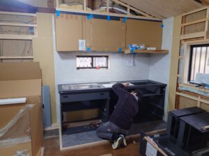 仕上げ材を貼り終えた後に、システムキッチンを据え付けていきました。