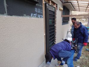樹脂アルミ複合サッシとはいうものの、割と重量があり、3人がかりで取付位置まで運び、取り付ける際も外側、内側の両方から支えながら取付を行いました。
