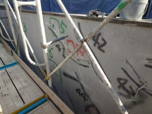アスベストを含む外壁の撤去作業も終わり、現在は外壁コンクリート爆裂部分に