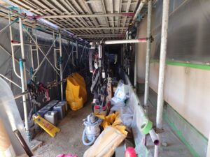 足場資材を人力で運び入れたので、時間がかかり大変でした。。。