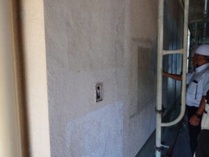 現状の外壁をめくり、下地調整や仕上げの左官工事をした後に塗装をします。