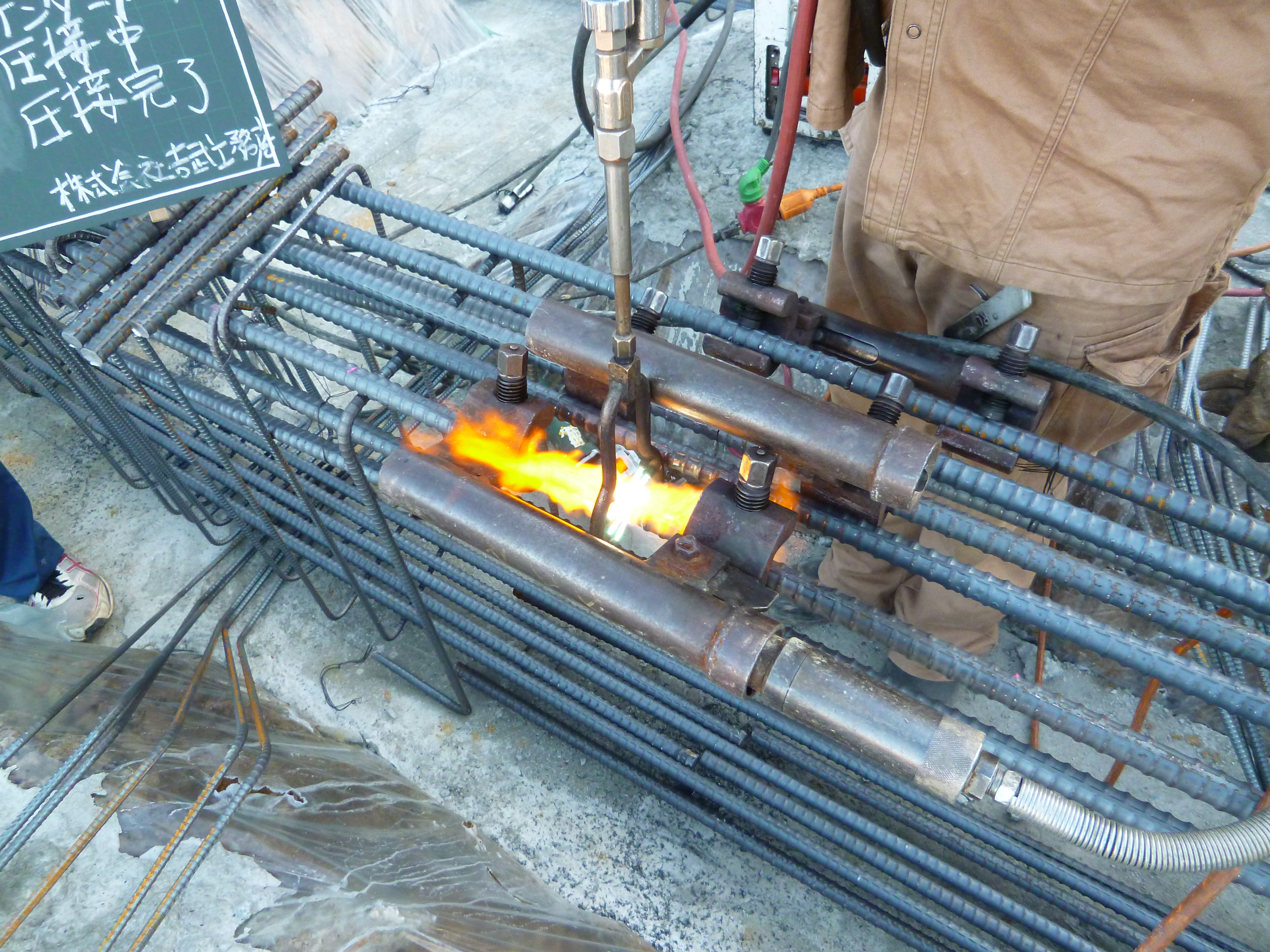 この圧接はガスバーナーのようなもので鉄を熱して溶かして引っ付ける方法、、、と思っていましたが!少し違うと施工した職人さんが教えてくれました。説明すると難しいのですが、簡単に言うとアセチレンガスと酸素の炎で鉄表面の酸化膜を取り除き、同時に機械での加圧と加熱を行います。そうすると鉄の原子同士が結びつこうとする力が生じて繋がっていくとのことです。この際、鉄の融点までは加熱されていません。