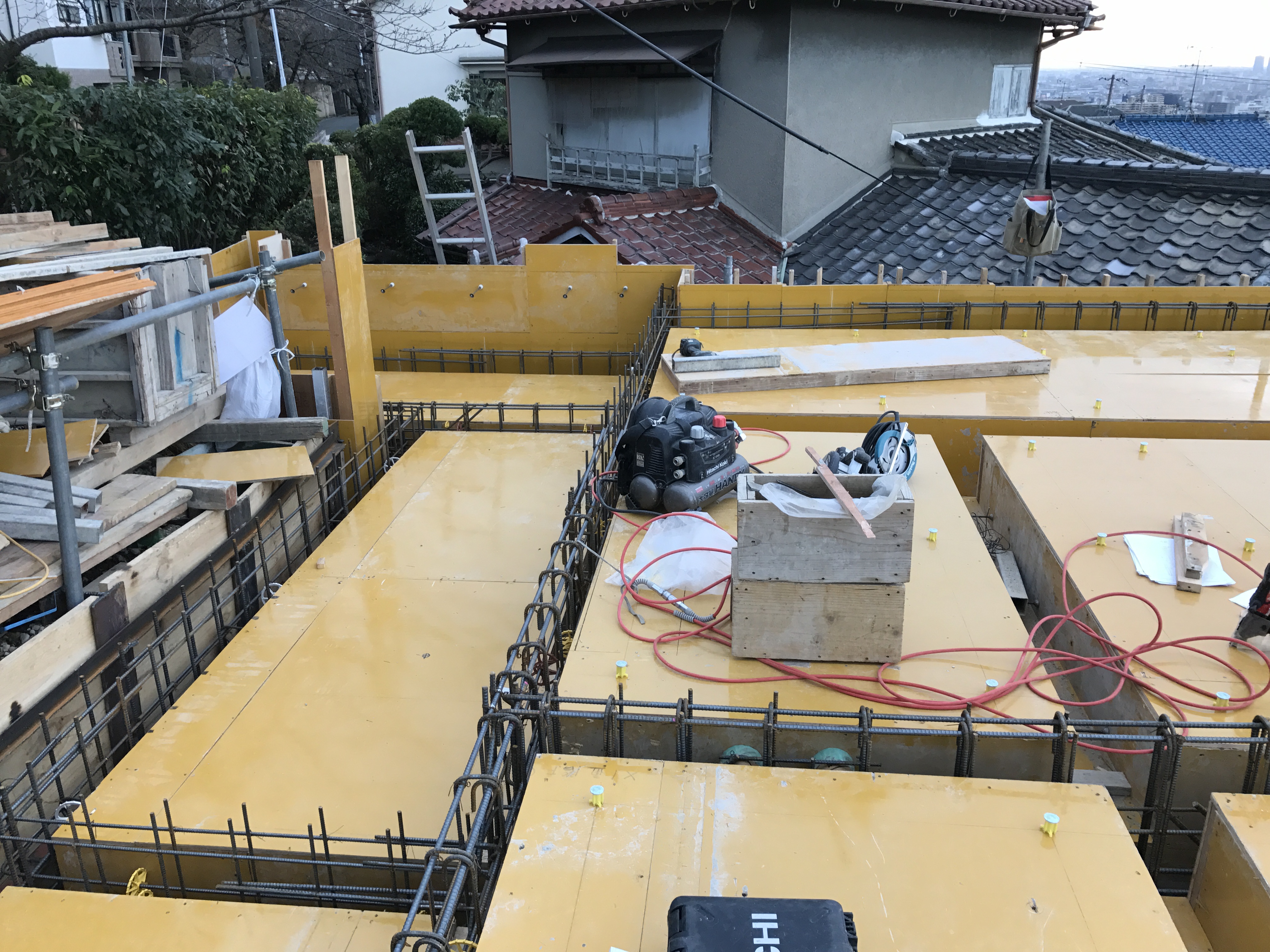 建物のうち構造体となるコンクリートをスラブと言います。今回では1階の天井部分(2階の床下部分)がスラブとなります。