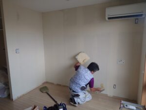まずは、既存の壁クロスを全てめくり、下地調整をしていきました。