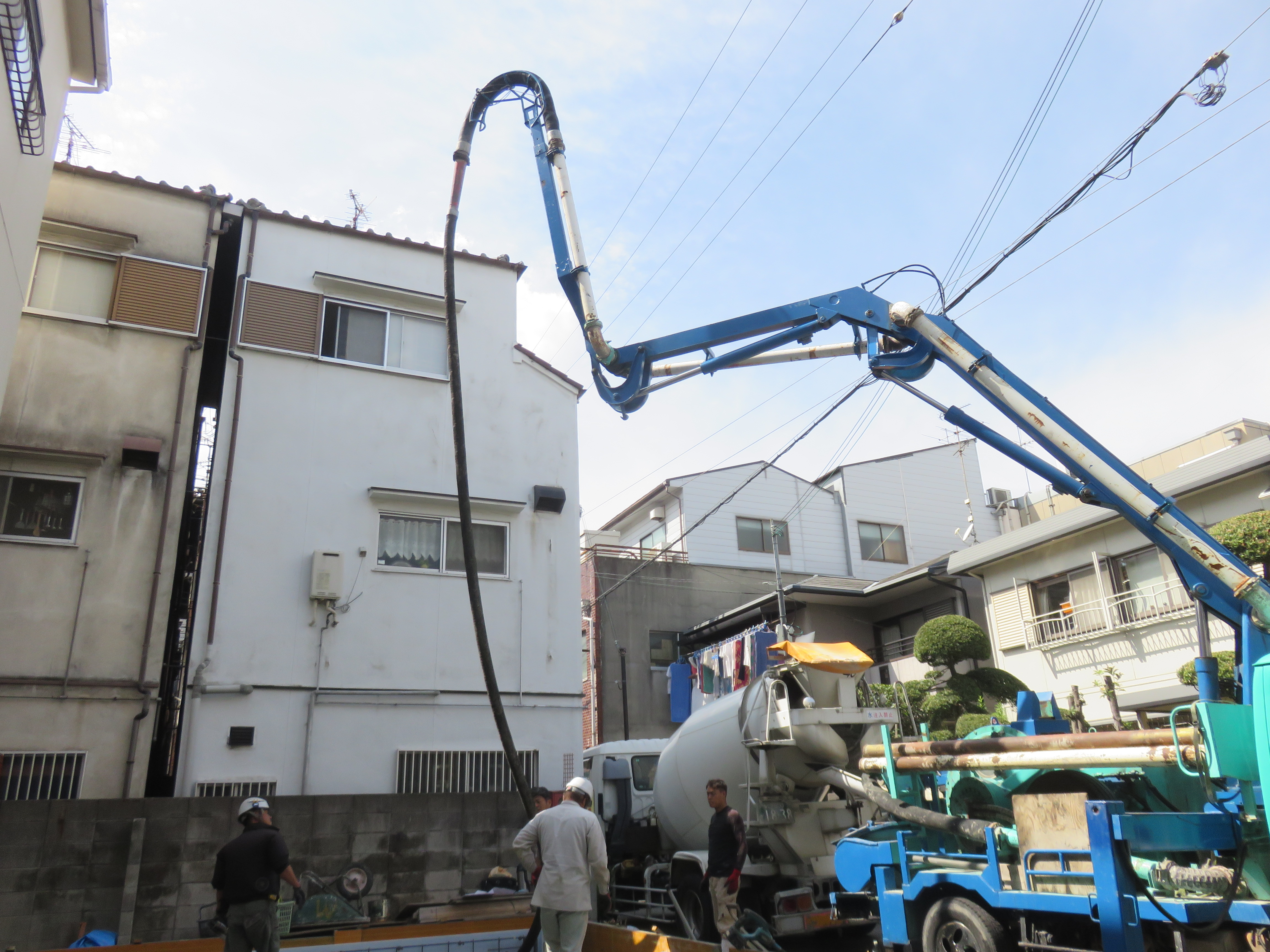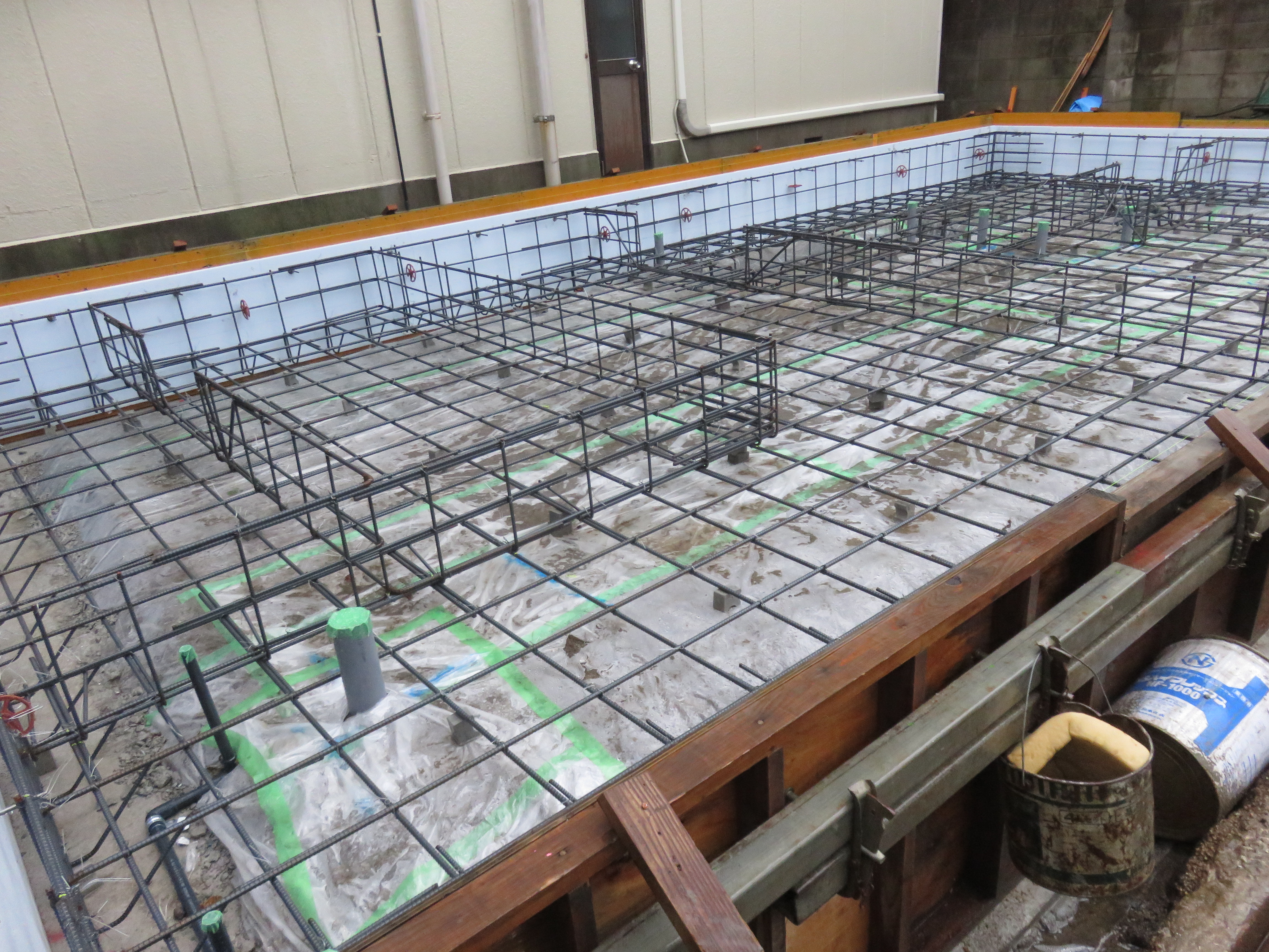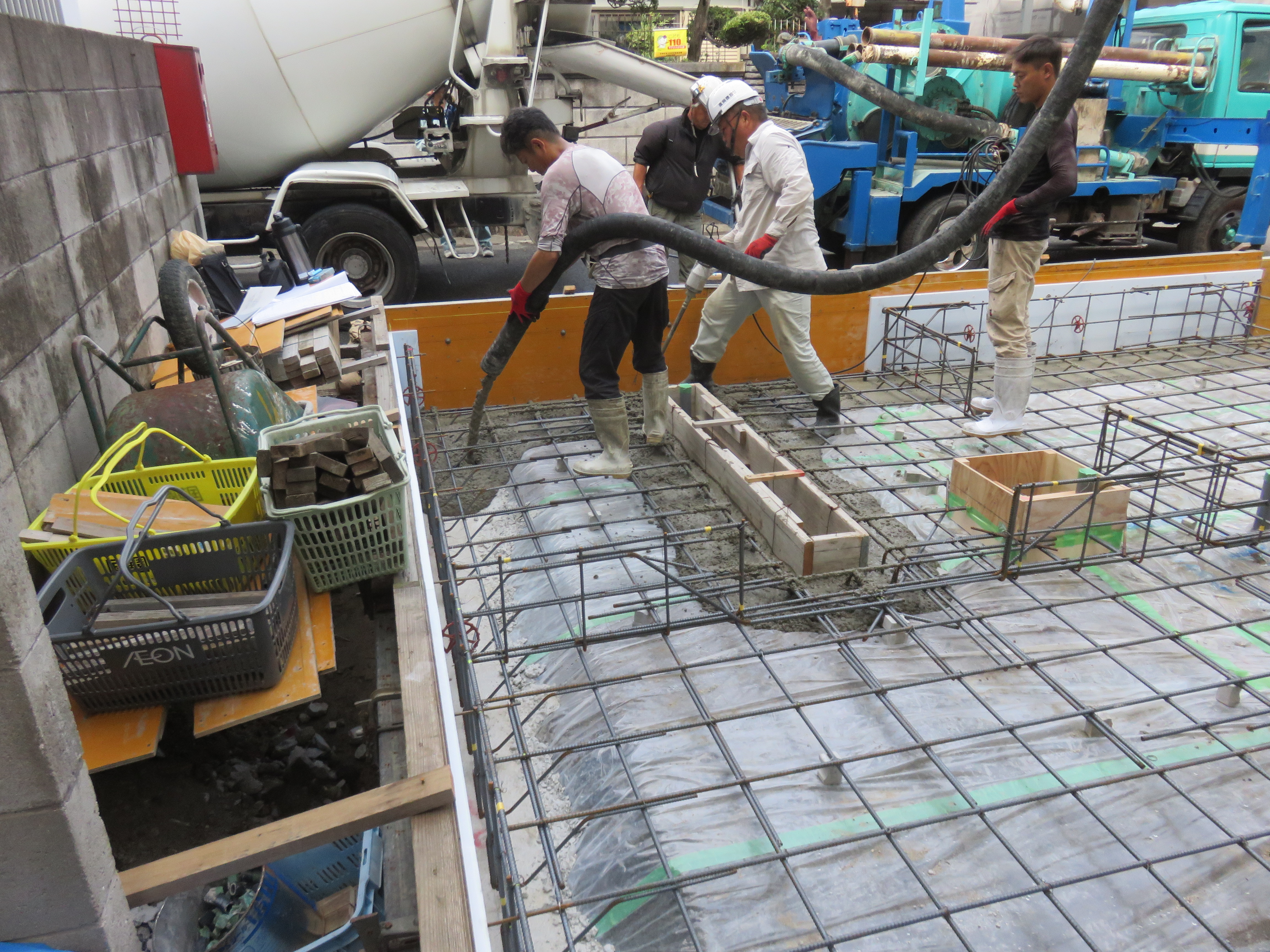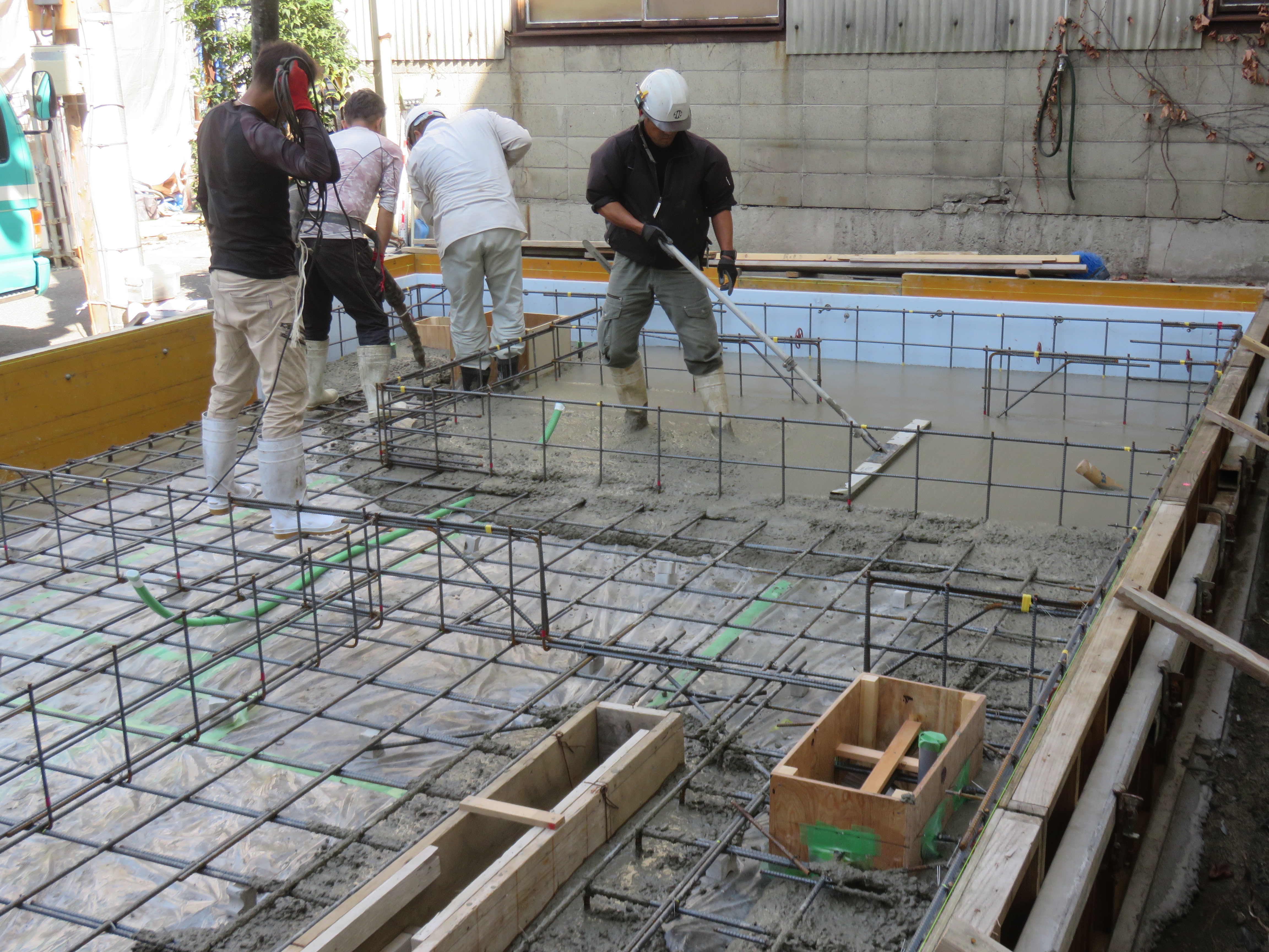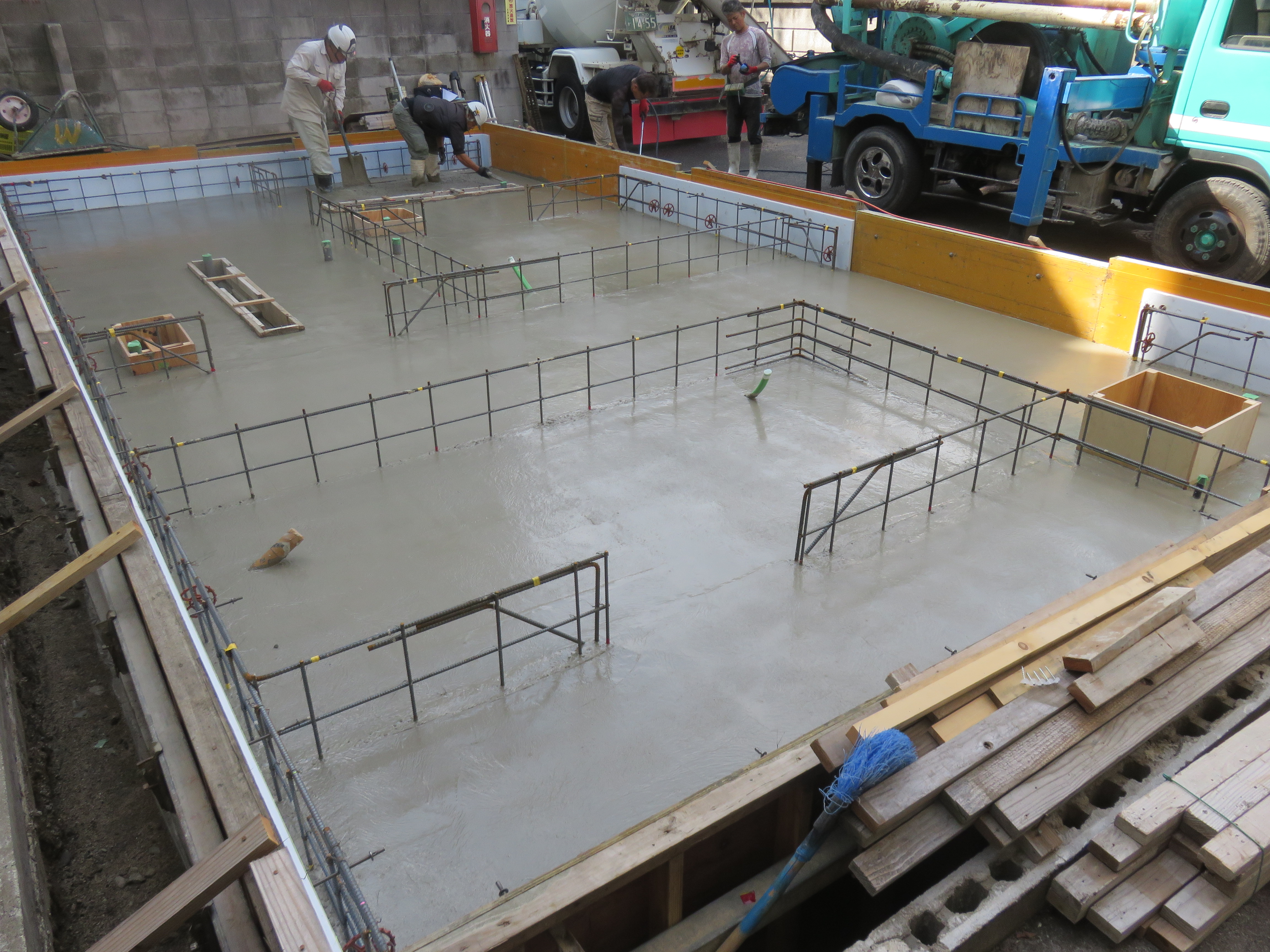 本日、基礎スラブの生コンクリート打ちまで行いました。