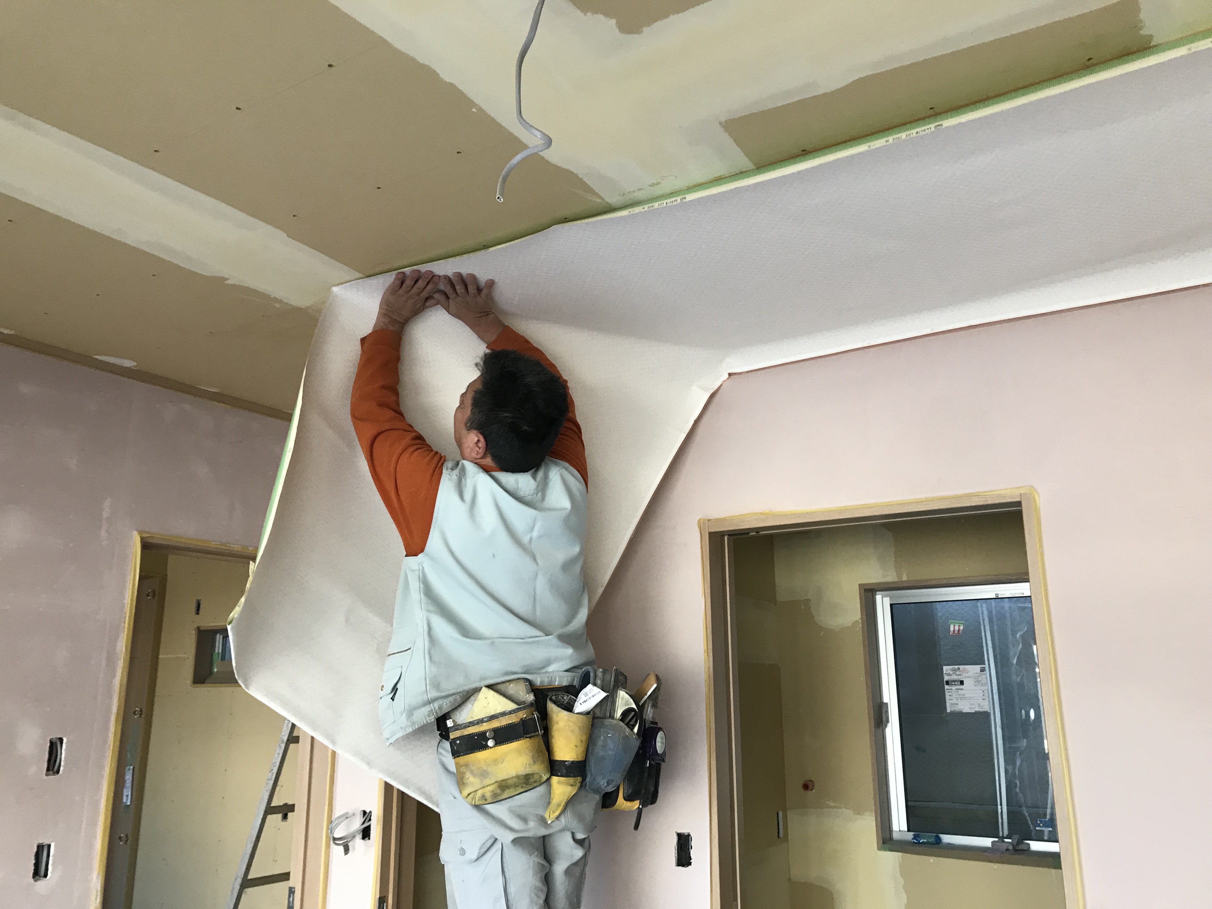 内装のメインとなる部屋は全て漆喰仕上げで、お施主様に塗っていただきます!ただ今弊社左官職人サポートの元、下塗りを行っています。