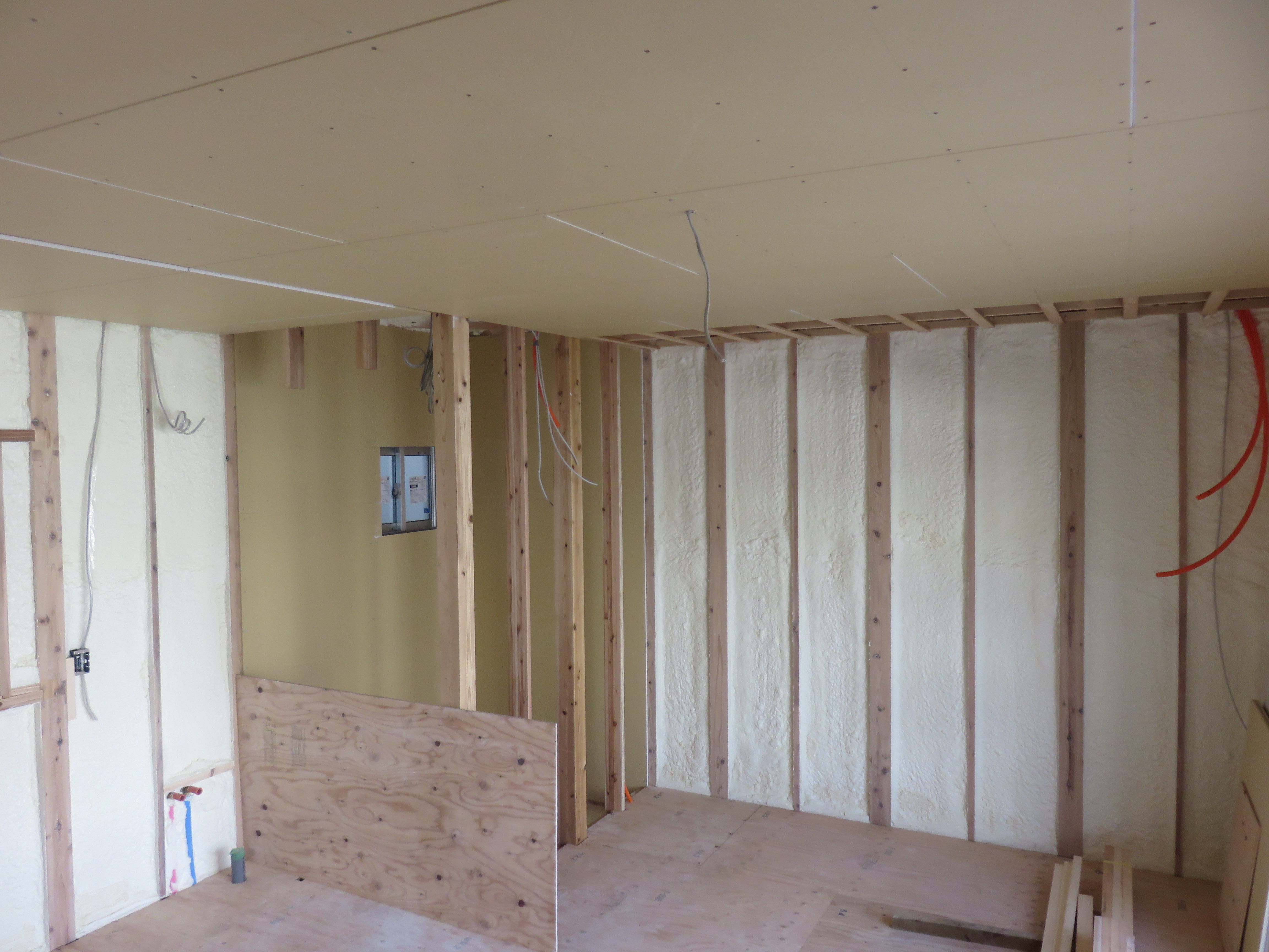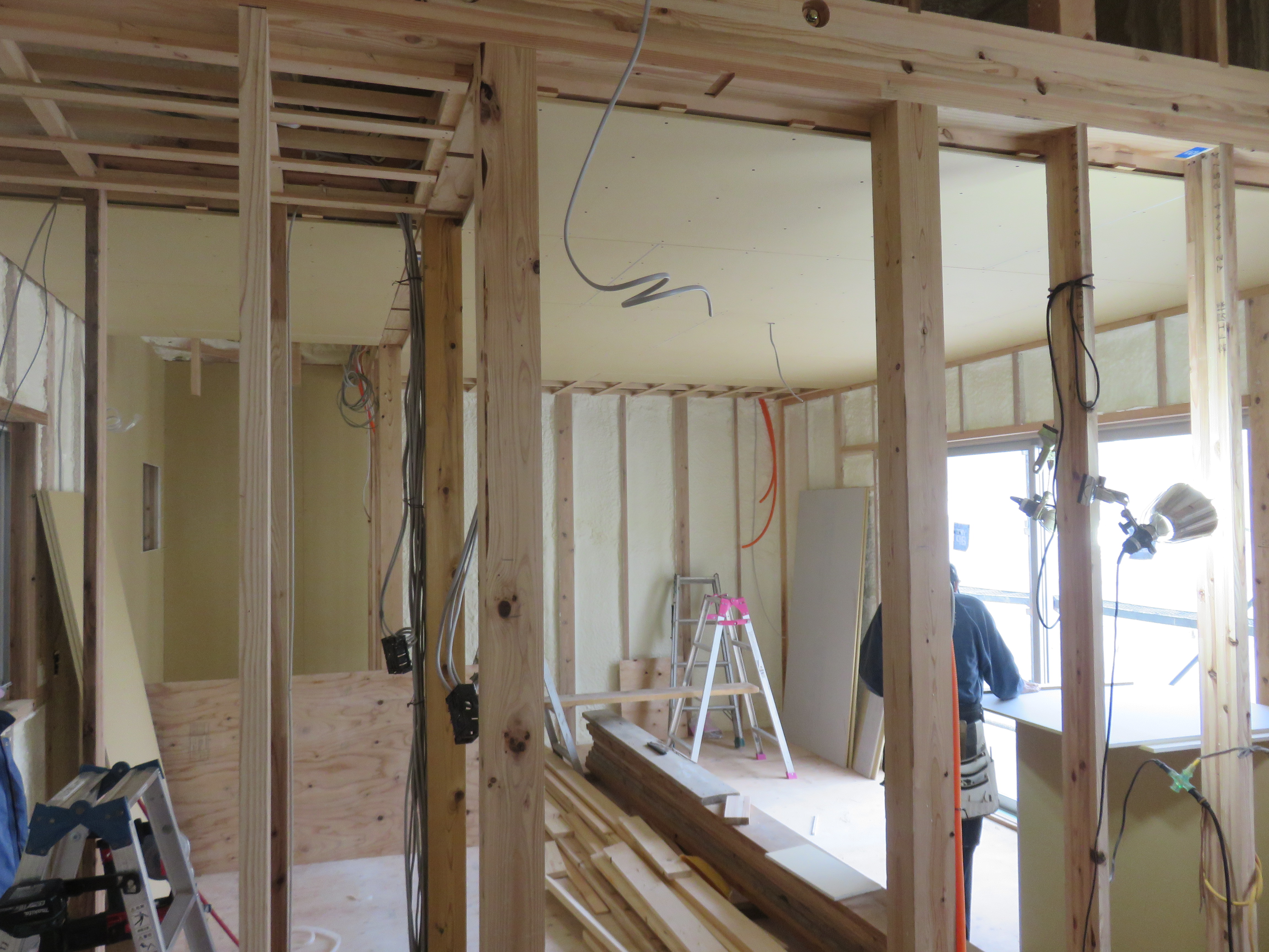 天井の下地造作が終わると、床張りや壁のボード張り等、