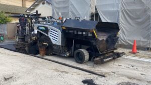 トラックからまだ柔らかいアスファルトを流し込んで開始です。奥から手前に向かって進んできます!