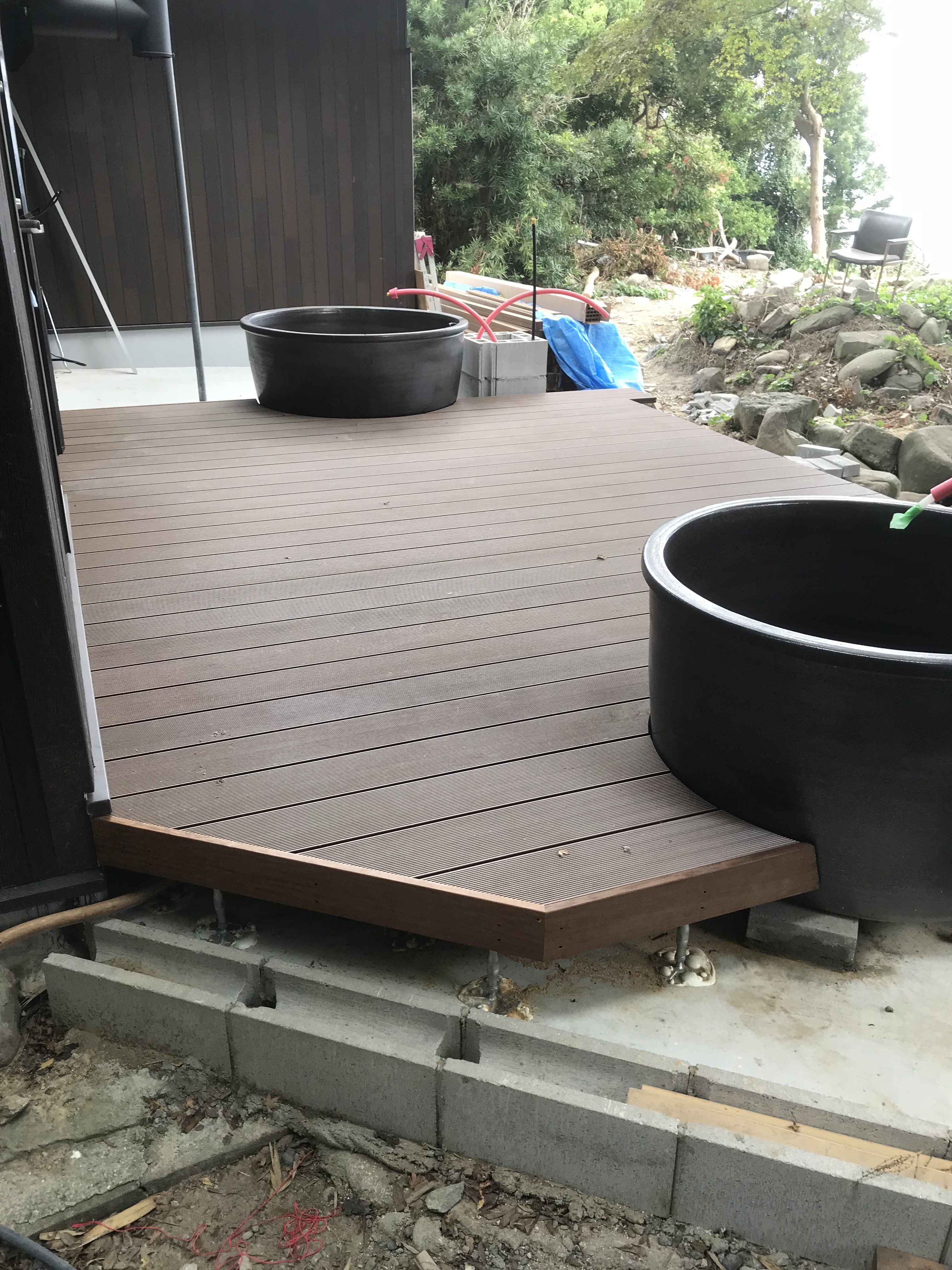 露天風呂のデッキ材を張り、段々と露天風呂っぽくなってきました!