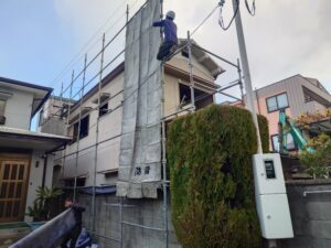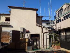 今回の解体対象となる建物と隣地との間が狭かったため、隣地の所有者様にご承諾をいただき、敷地内に足場を立てることを許可いただきました。