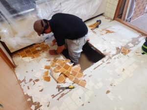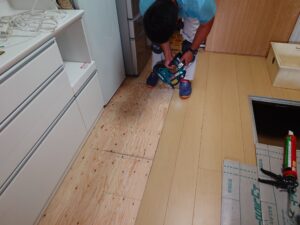 既存のキッチンの床は塩ビシート、和室は畳ですが、これをどちらもフローリングの仕上げにしていきます。