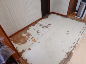 既存の床の塩ビシートをめくり、下地の状態にしました。