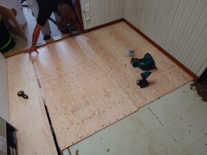 この上にもう1枚、新たに厚さ12ミリの構造用合板を張り、仕上げのフローリングを張り上げました。