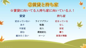 これらを踏まえ、賃貸と持ち家で向いている人の環境を比べてみましょう!