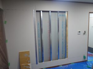 石膏ボードの壁を外すと、骨組みとなっている軽量鉄骨材(スタッド)が出てきました。
