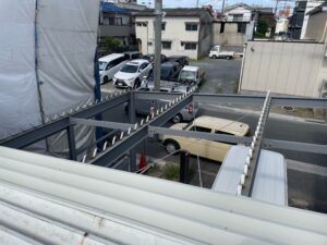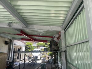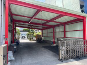既存の柱や梁、折板の錆がめだっていたためそちらの塗装工事も行いました。