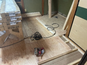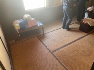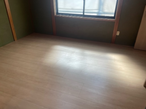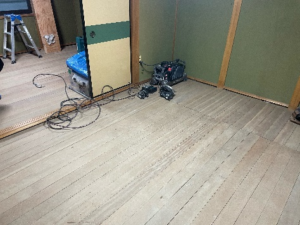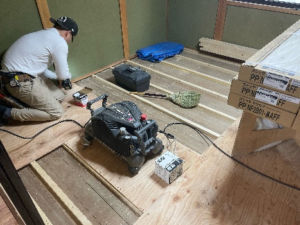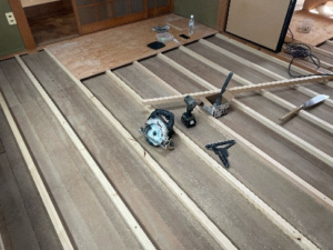 畳を撤去し、敷居の高さにフローリングの仕上げが同じになるよう下地を組んでいきます。