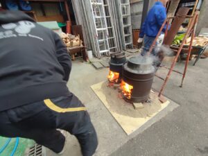 前日から準備をし、朝には火を焚いて準備万端!