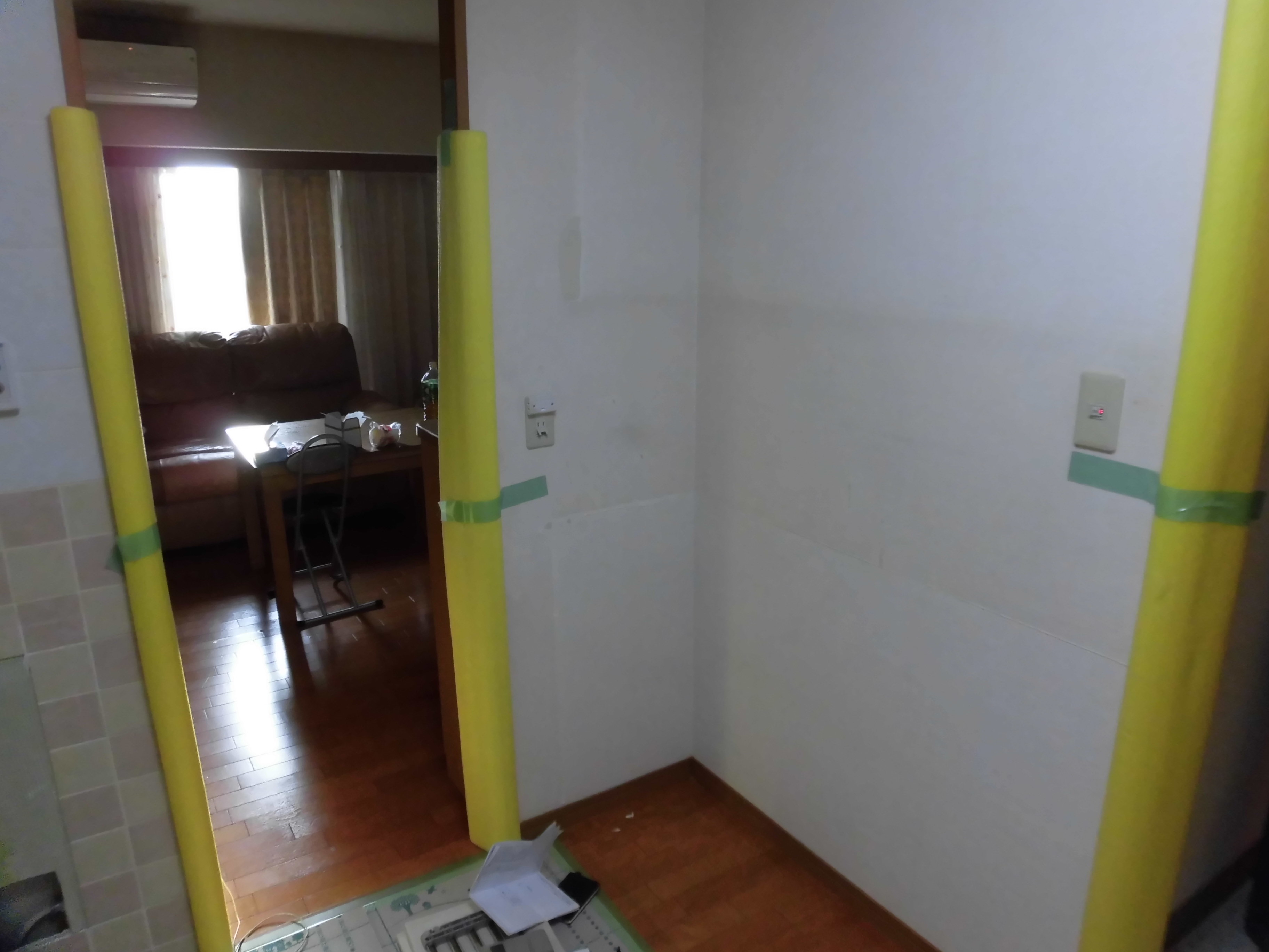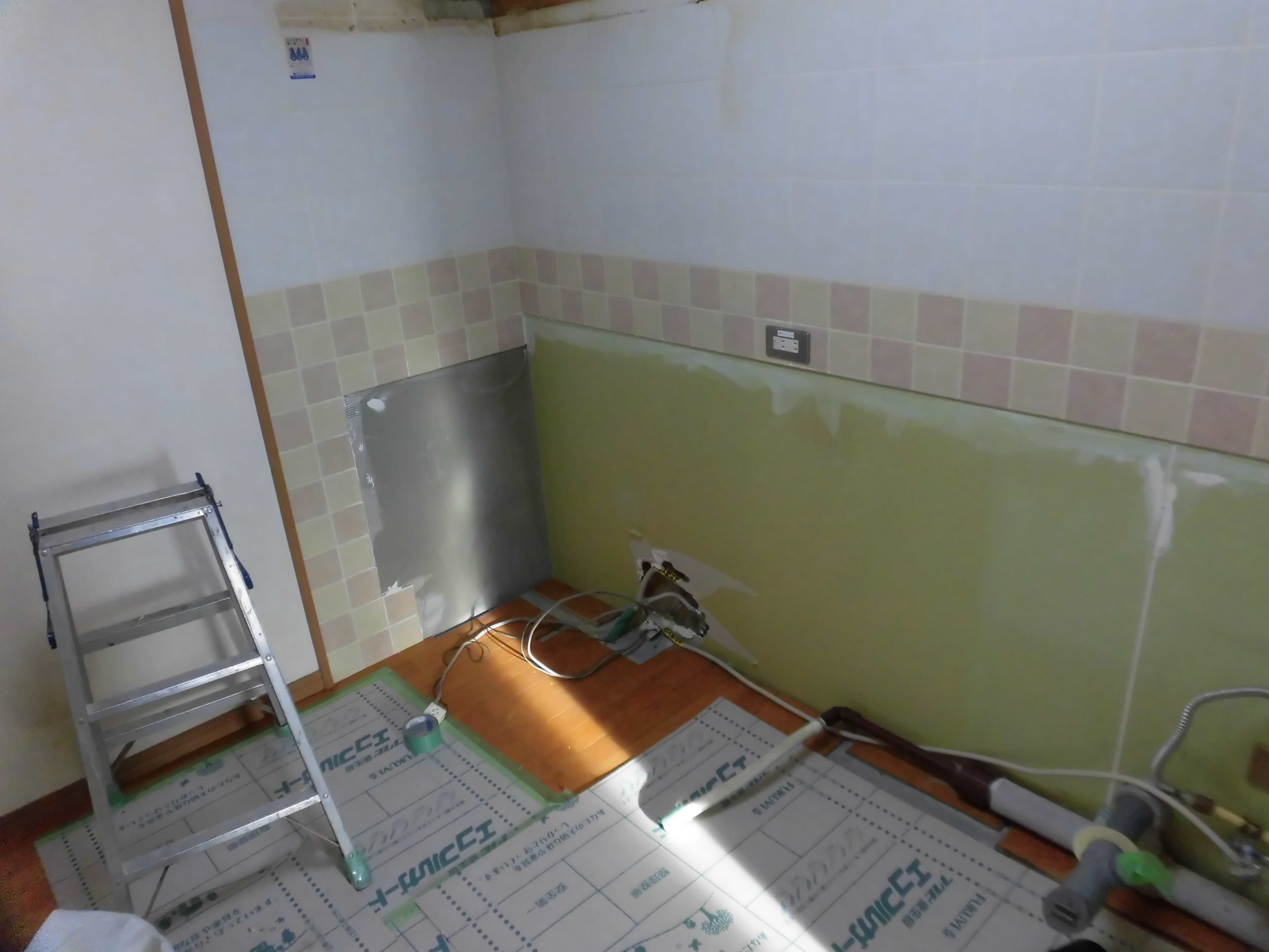 そして次に、壁と天井のクロス、脱衣場床のクッションフロア貼りです。