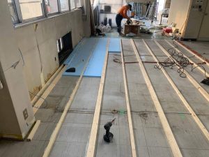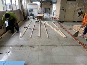 電気や、水道設備の配管工事を行い、大工さんが床を作っていっている所です。