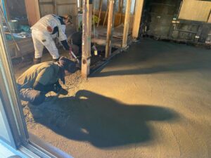 このままでは、湿気により、床材にカビが生えたり、腐食する可能性があるため、防湿シートを敷きコンクリートを打ちました。