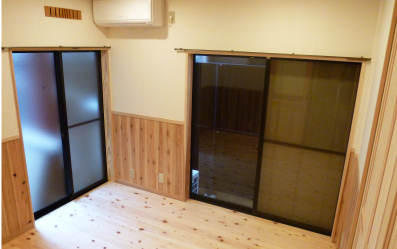 腰板に、吉野杉を使わせて頂き、腰上・天井は土佐和紙クロス。