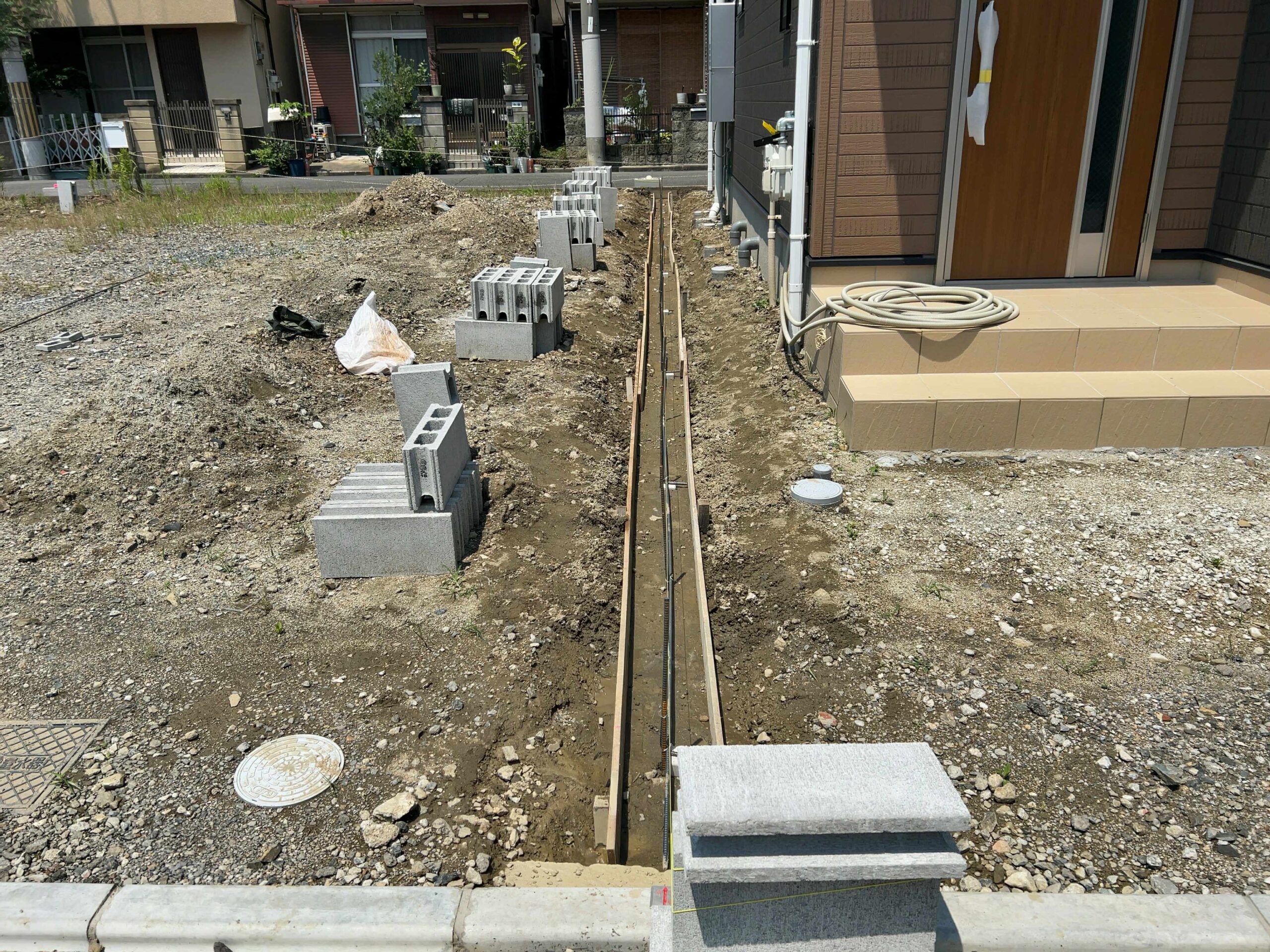 分譲地の家と家の間の境界線を簡易的にロープで引いていましたが、